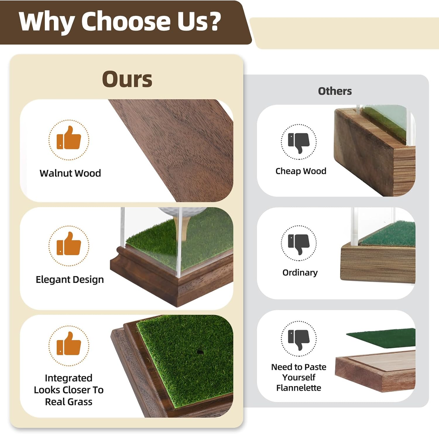- 【Golf ball display case for 5 balls】Our Golf Balls Holder Display Case, Including Walnut Wood Base + Clear Acrylic Cube + Lifelike Artificial Turf + 5 Wooden Golf Tee , Overall size 10.63''x2.75''x4.01'', Stackable ,Great for displaying Hole In One Golf Ball,memorabilia,jewelry,toys, trinkets etc.