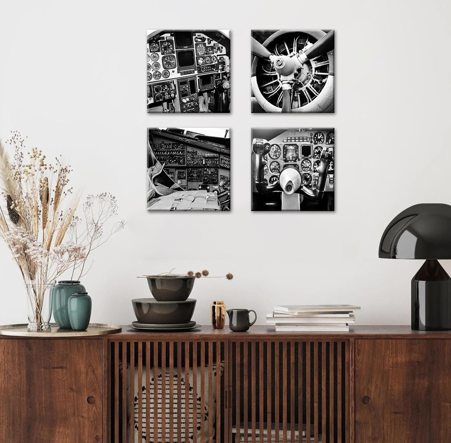 - Vintage Airplane Wall Art: This 4-panel canvas set features a close-up of a vintage airplane propeller in striking black and white. Perfect as airplane wall art for offices, bedrooms, or man caves, it adds a bold, masculine touch to modern or industrial interiors.