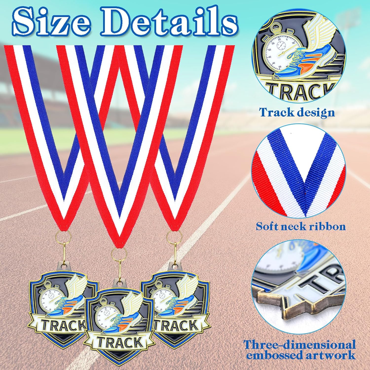 - Eye Catching Track Design: these track medals bulk incorporate an elegant shield-shaped design, winged sneakers, and a timer-inspired motif that embody the essence of track and field competition; Our sports awards medals are furnished with 3-color ribbons, the hook of medals are easily detachable, easy to collect and appreciate