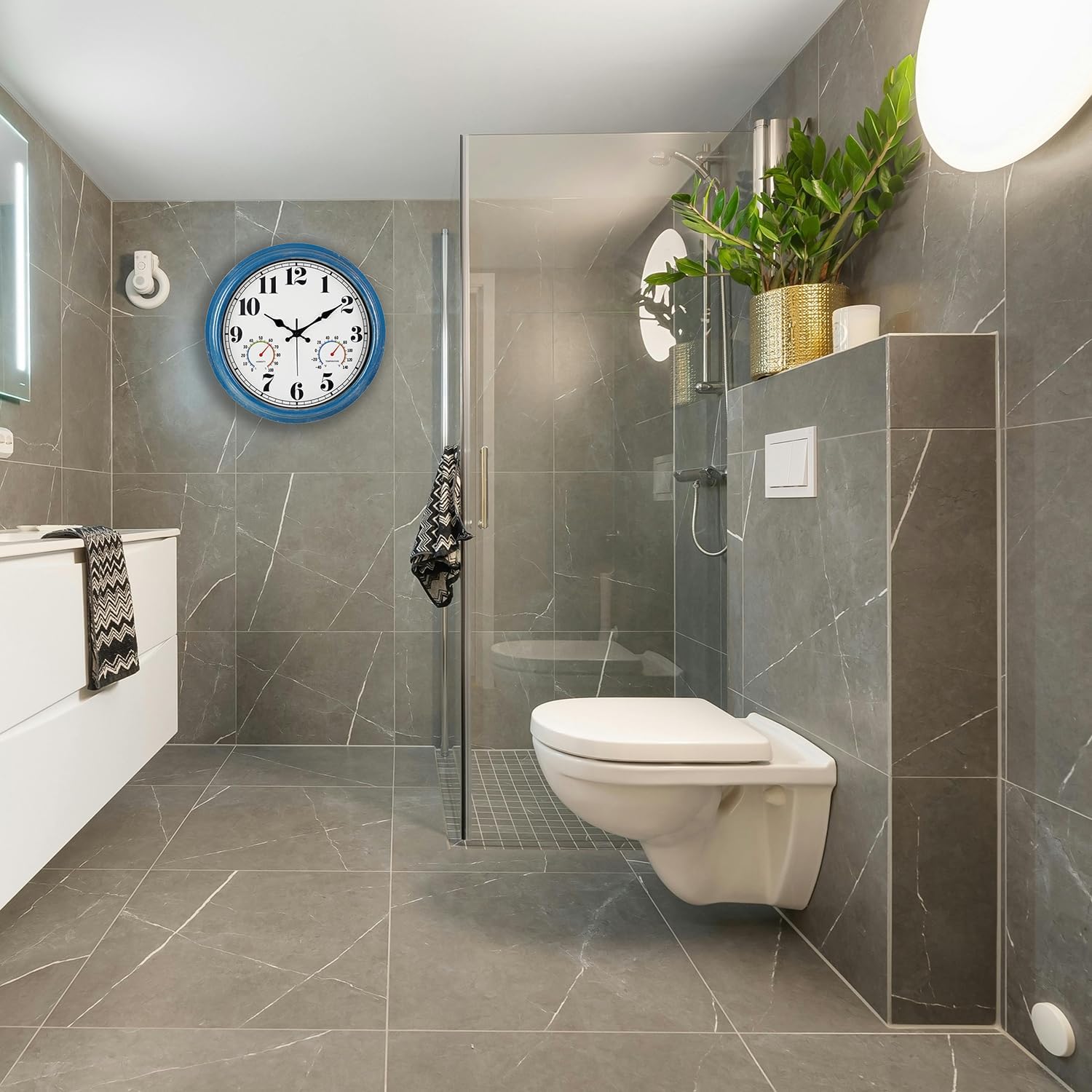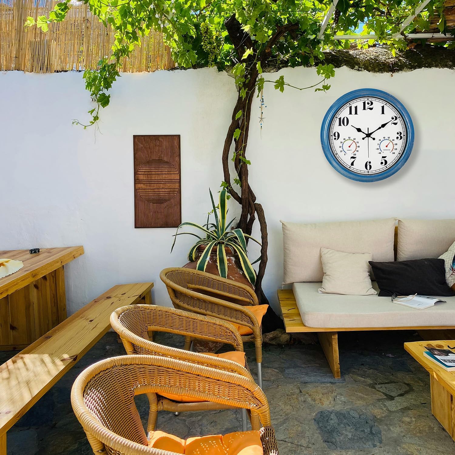 JENLYSTIME 16 Inch Blue Vintage Waterproof Indoor/Outdoor Wall Clock with Thermometer & Hygrometer, Large Numerals & Silent Sweep Movement - Ideal for Porch, Garden, Pool, Bathroom