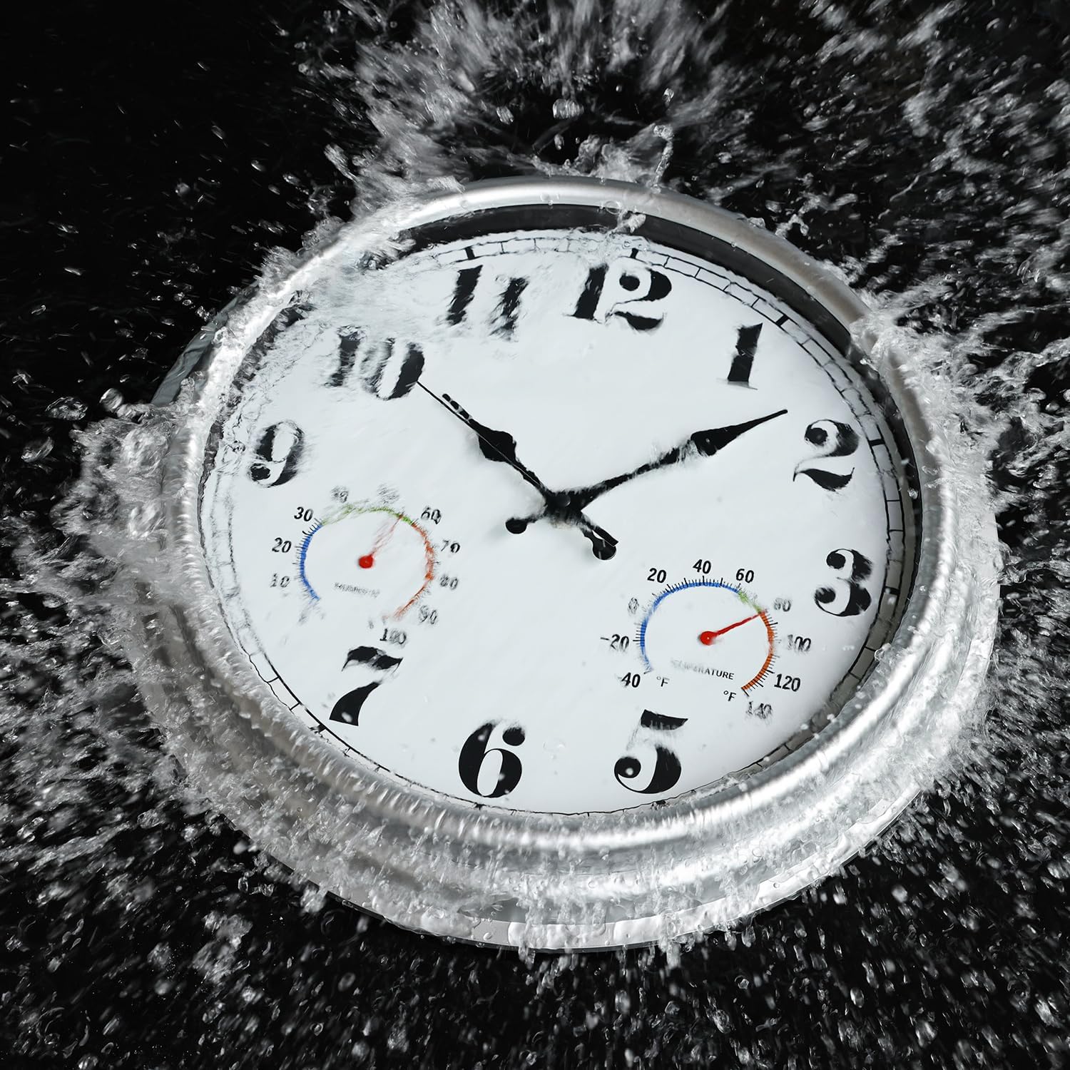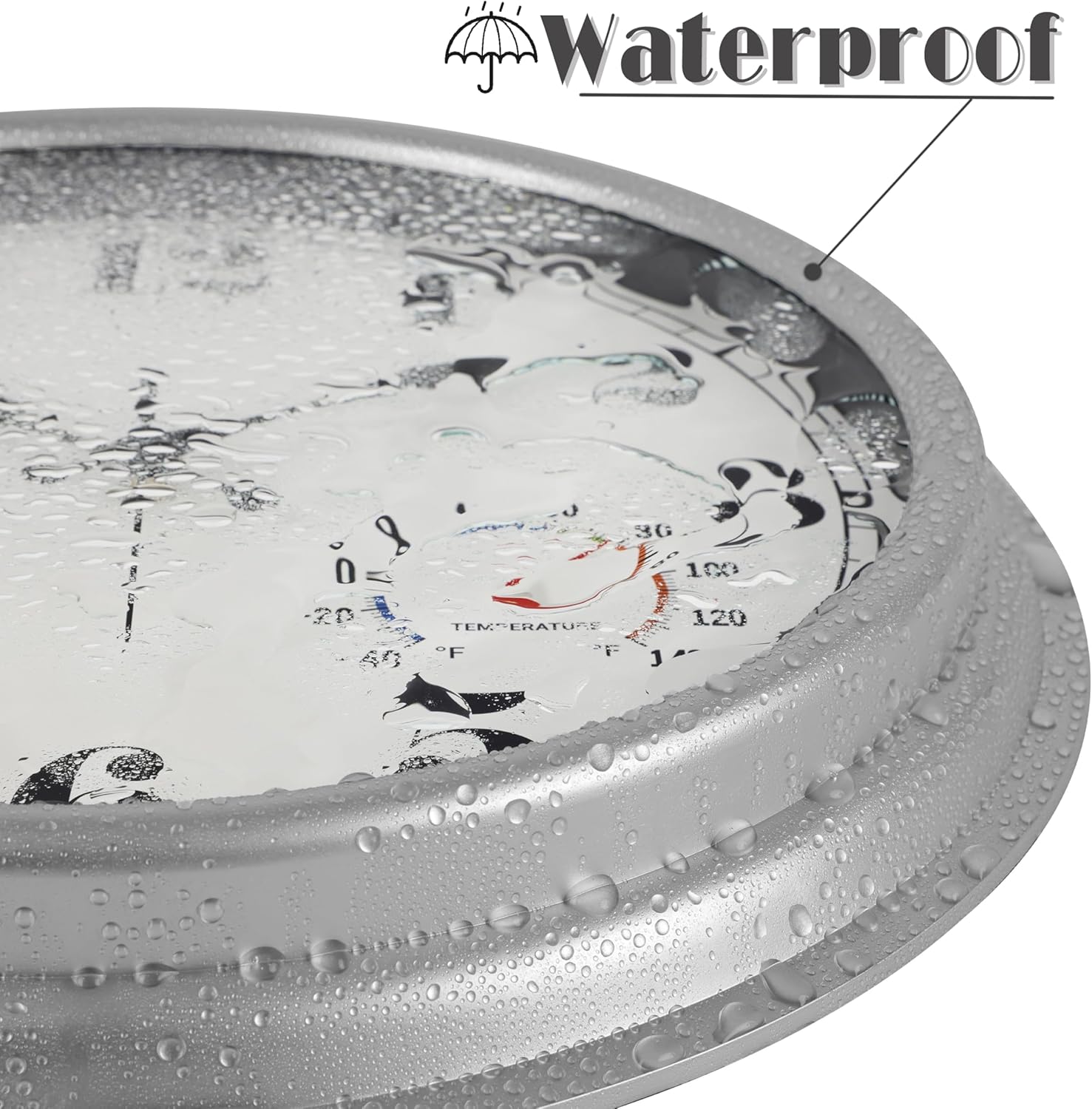 JENLYSTIME 16 Inch Silver Vintage Waterproof Indoor/Outdoor Wall Clock with Thermometer & Hygrometer, Large Numerals & Silent Sweep Movement - Ideal for Porch, Garden, Pool