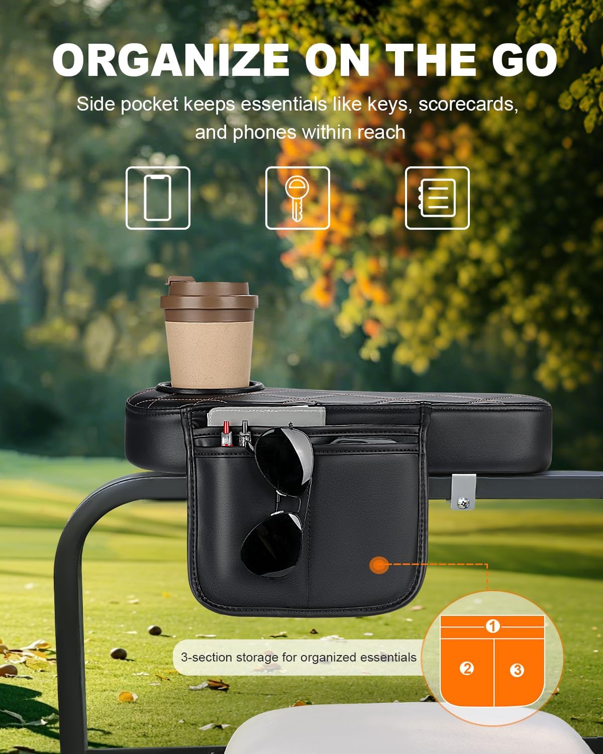 Golf Cart Armrest with Cup Holder & Rear Seat Organizer, No Drilling Golf Cart Diamond Arm Rest Fits 1" Square Tube Frame Compatible with EZGO Club Car Yamaha, Enhanced Storage & Comfort