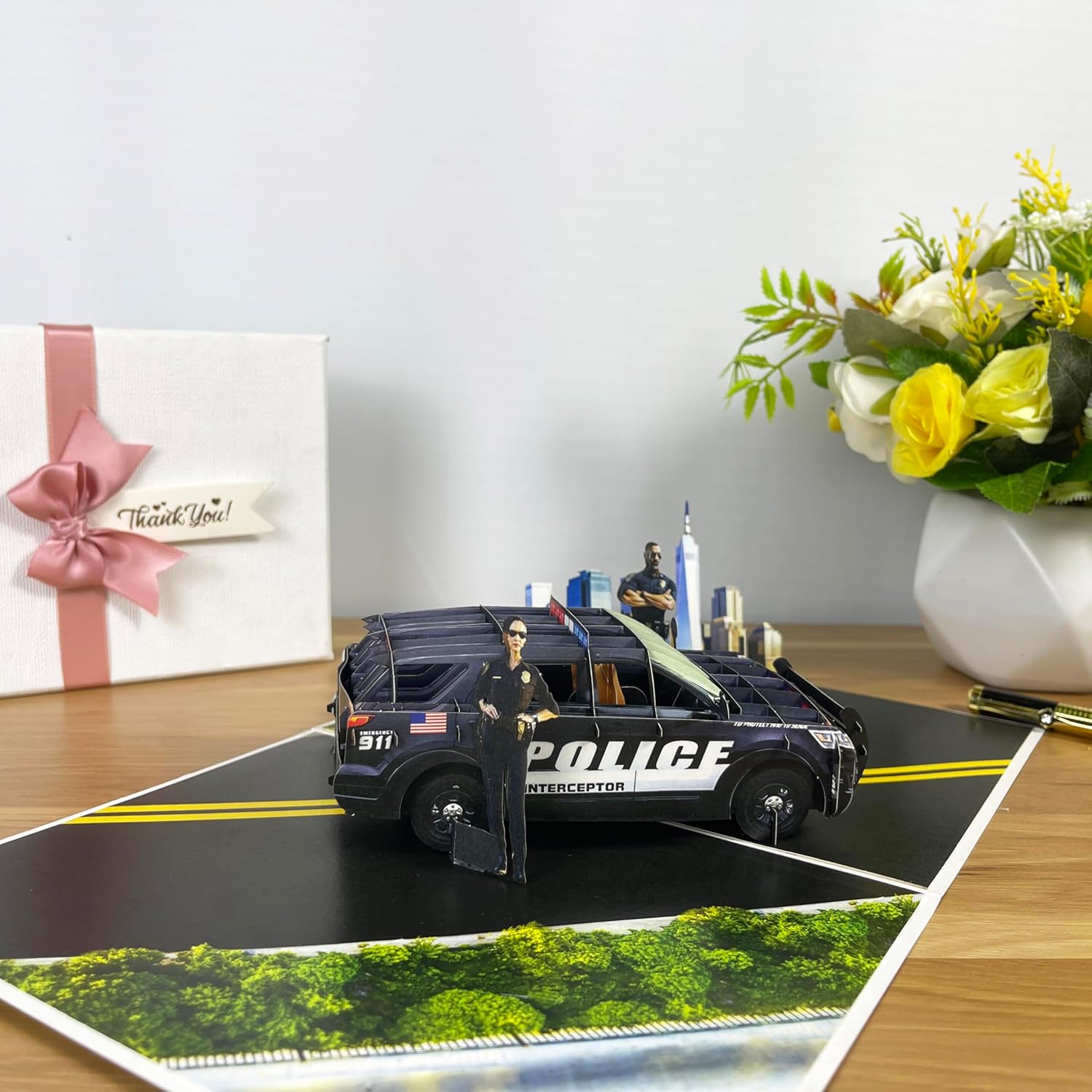 - Bold Police Car Design: The Police Car 3D Popup Card features a dynamic, detailed patrol car racing into action — a perfect surprise for law enforcement supporters, officers, or kids who love police vehicles.