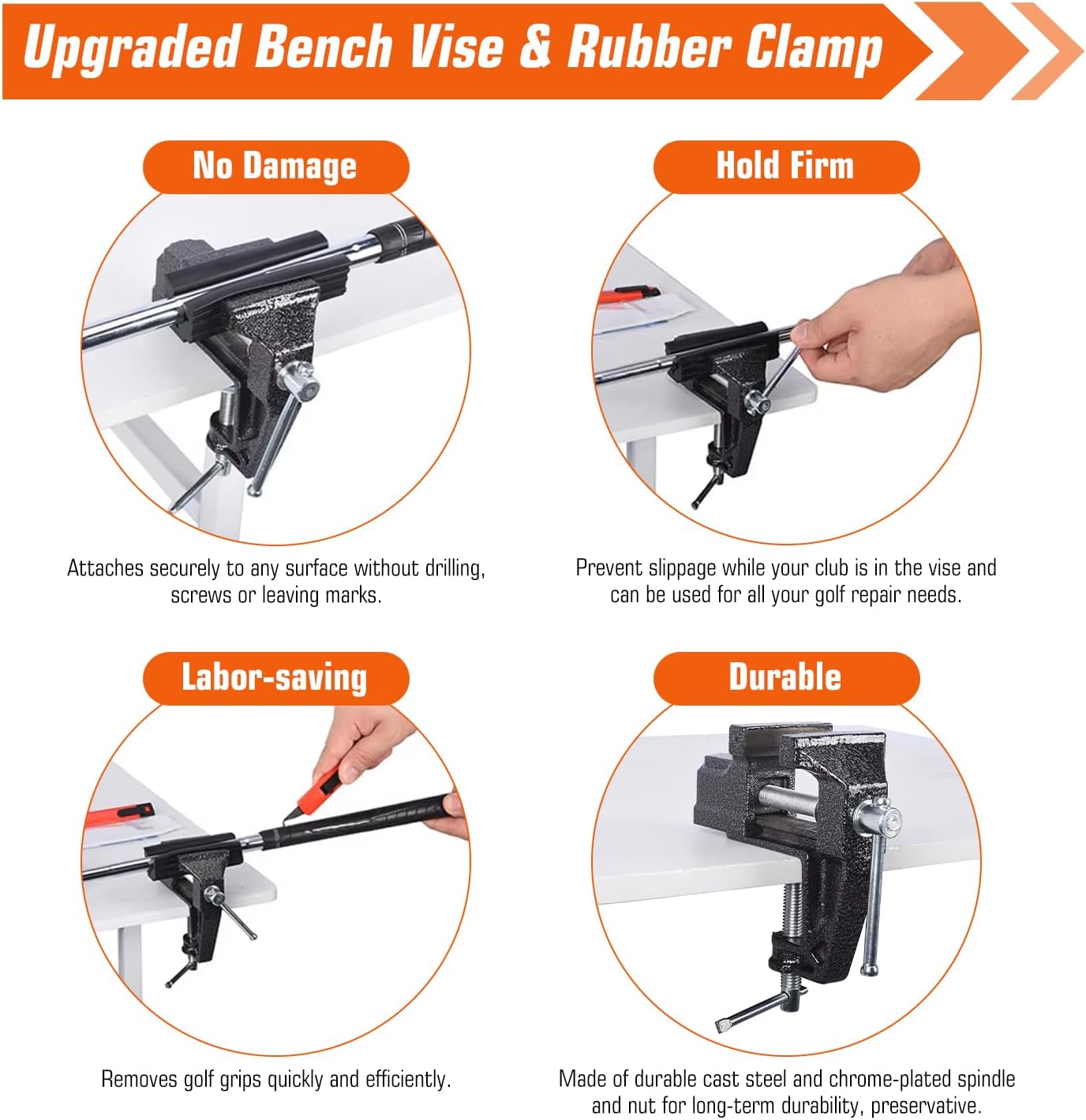 - NO-DRILL TABLE VISE: Portable vise tools securely holds any shaft during grip changing. Attaches to any surface without drilling without causing damage.