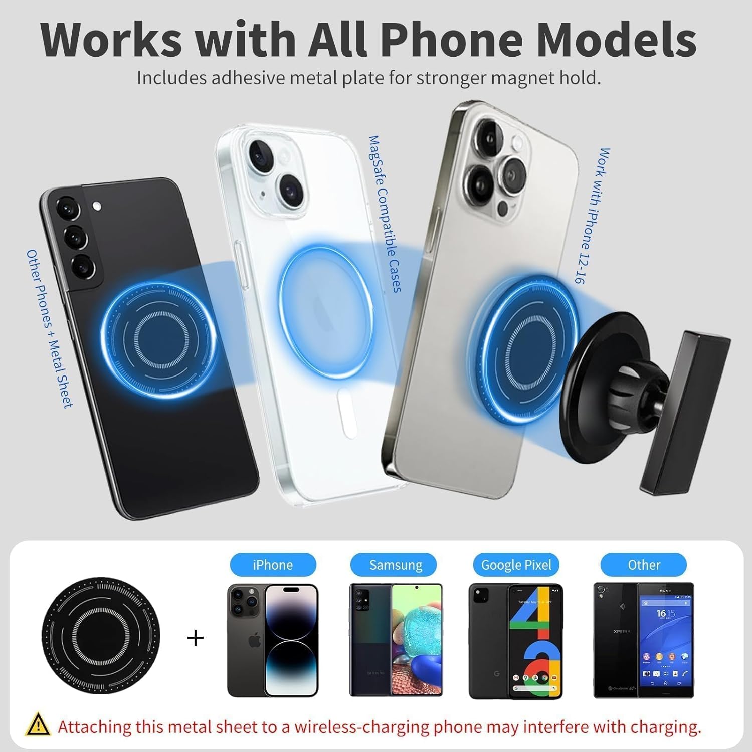 - Universal Compatible: Magnetic cell phone holder for golf cart works with all phone models. It’s fully compatible with iPhone16/15/14/13/12 series and other MagSafe-enabled devices—just snap them on directly.(Note: Comes with adhesive sheet metal to boost magnetic strength.) For other phones, simply use the included adhesive sheet metal to enhance magnetic strength for use with the magnetic phone holder for golf cart