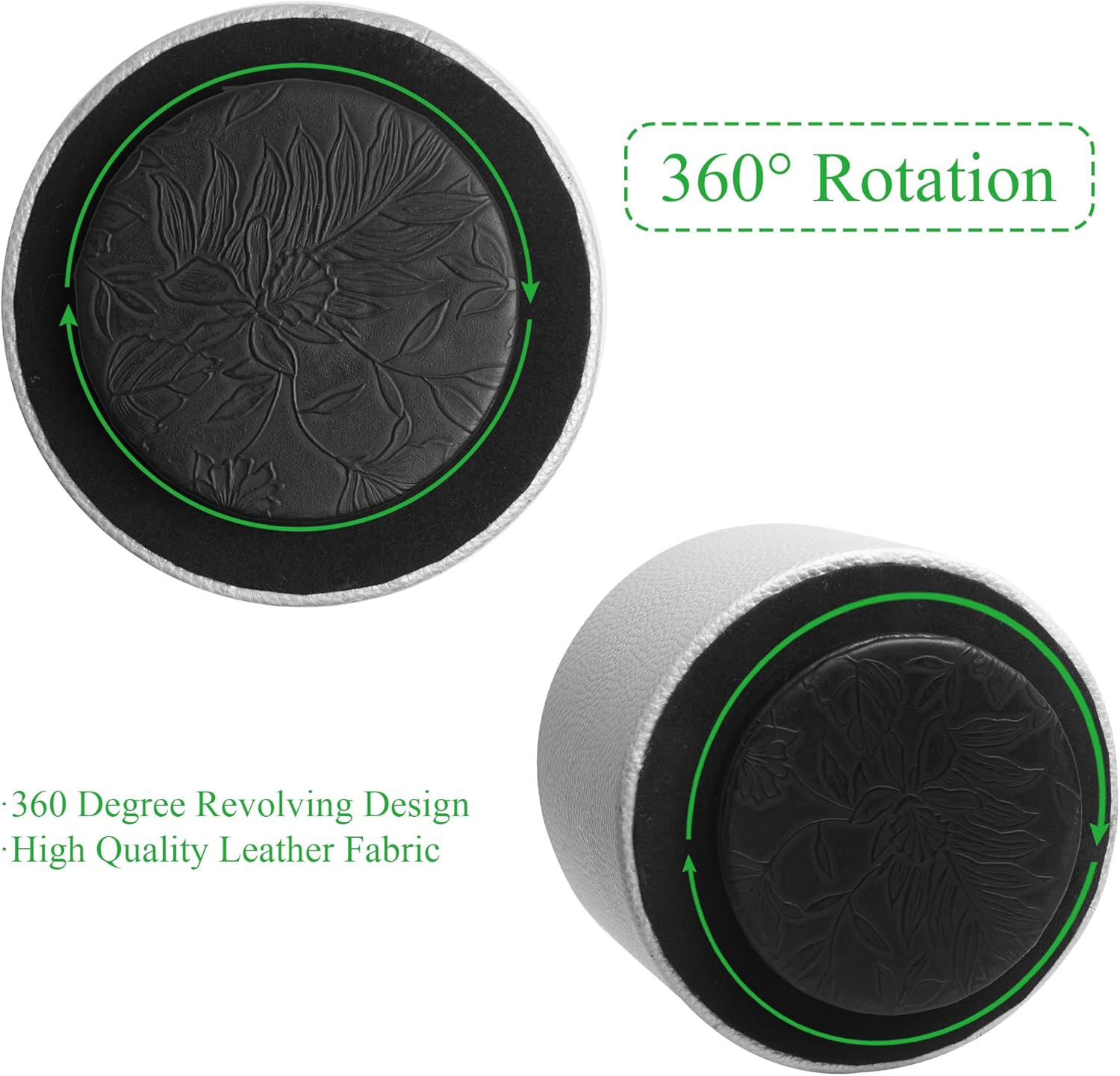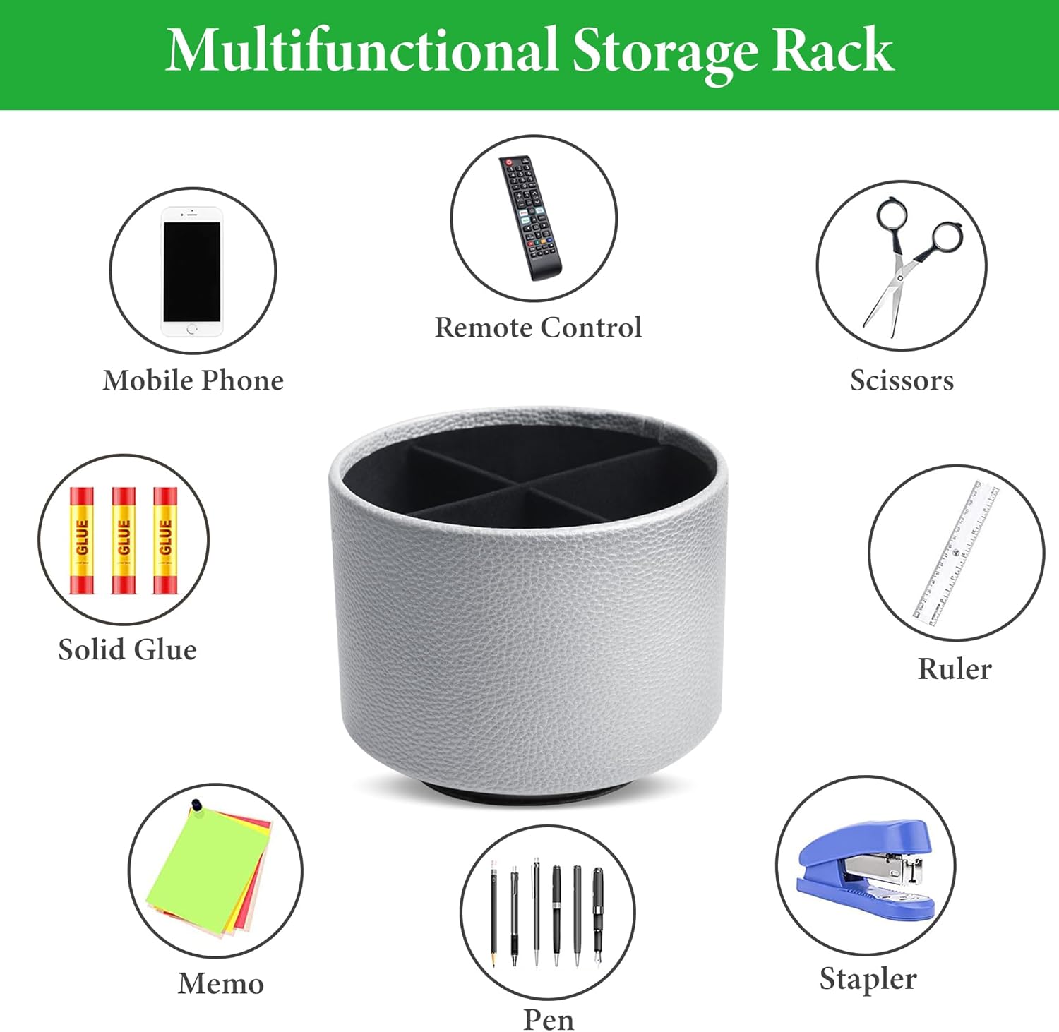 Hennaja Round Leather Art Supply Organizer,Remote Control Holder,360 Degree Spinning,Multi-Functional Pencil Holder,4 Compartments Desktop Stationary Organizer(1-Lichee Silver)