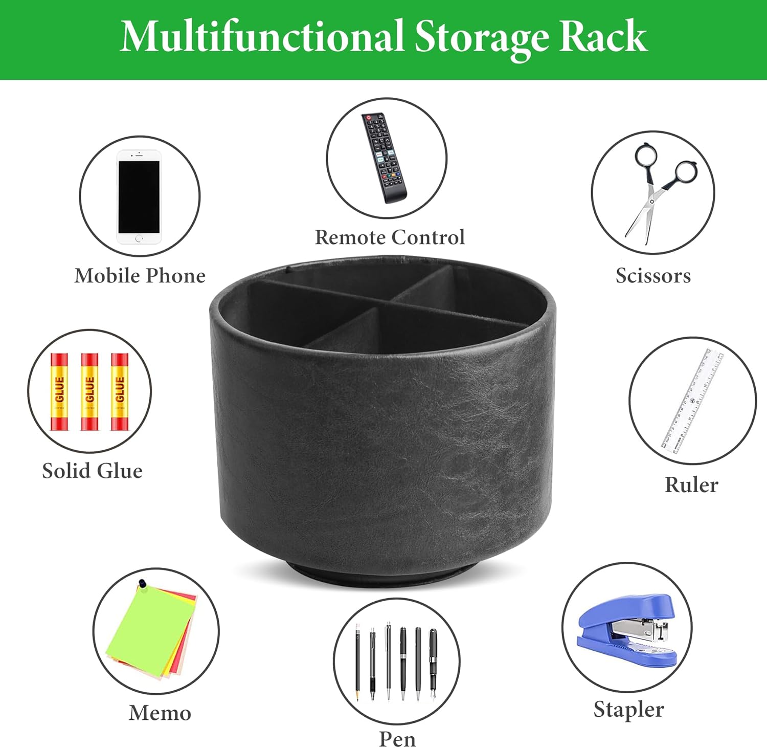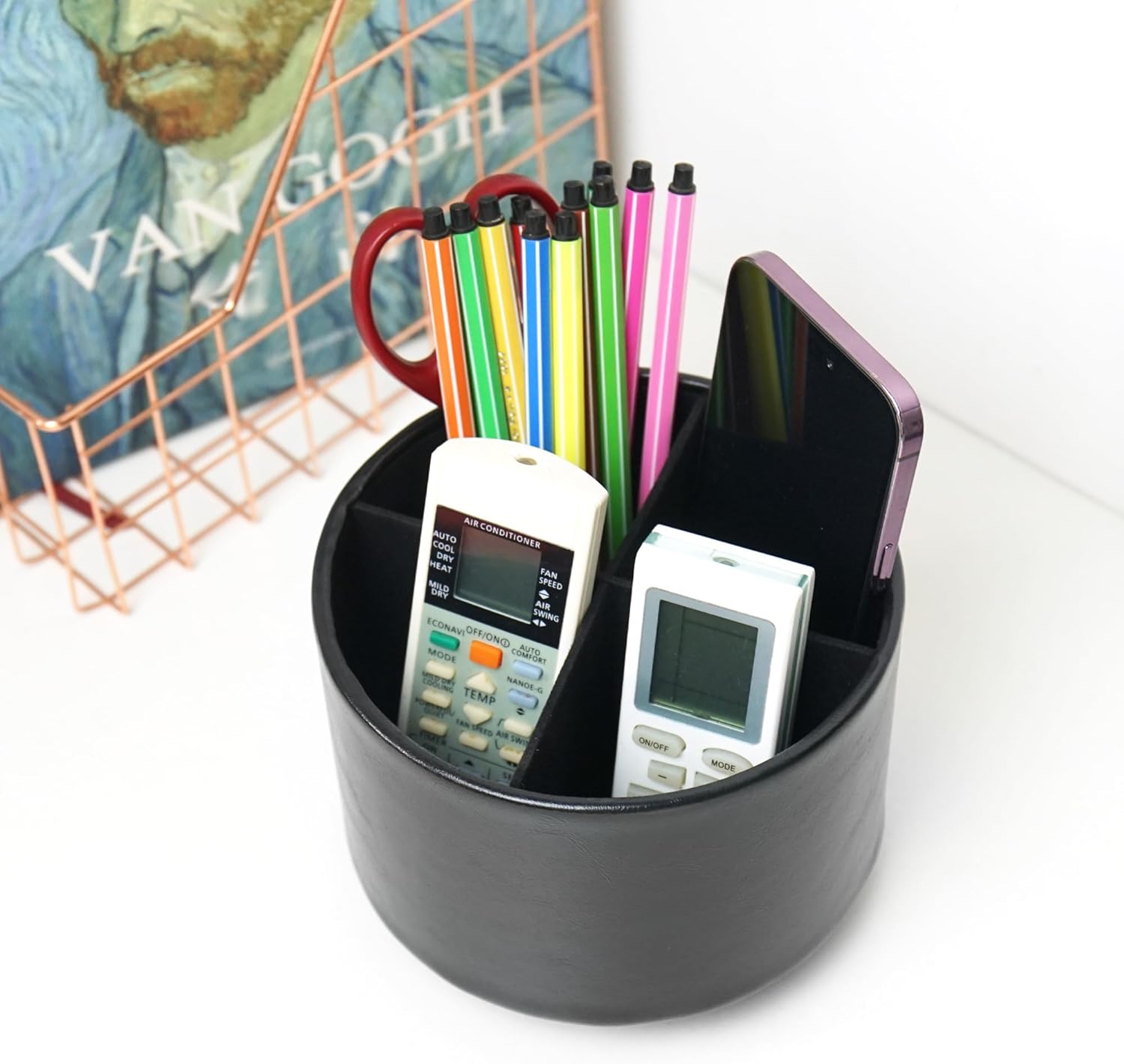 Hennaja Round Leather Art Supply Organizer,Remote Control Holder,360 Degree Spinning,Multi-Functional Pencil Holder,4 Compartments Desktop Stationary Organizer(1-Oil Black)