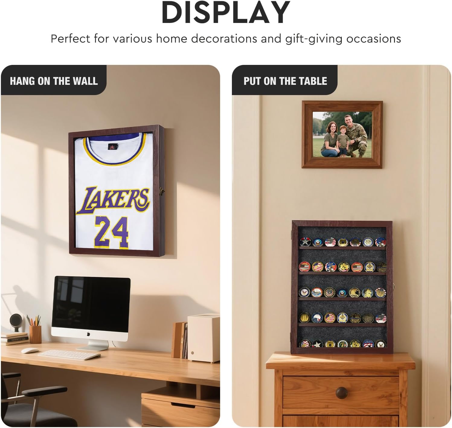 - 【Customizable Display Case】Adjustable dividers (5 slots) fit varied collections: challenge coins, geocoins, miniatures, casino chips. Vintage lock adds security for valuables. Neutral wood-grain frame complements rustic/modern décor. Back hooks allow vertica mounting