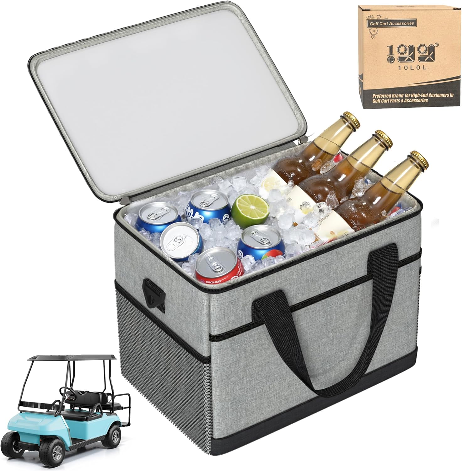 - 27L Waterproof Golf Cart Ice Bag for Ymaha/EZGO/Club Car:Made with 600D Oxford fabric, this PGA-approved cooler bag keeps drinks cold 6+ hours and resists rain/spills. Oversized zipper fits 30+ cans, while multiple pockets organize tees & gear. 1.1Lb ultralight design with universal straps.