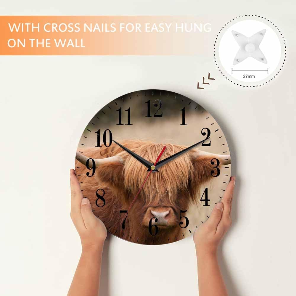 Mxocom Cow Wall Clock Brown Highland Cattle Cow Animal Farming Countryside 10 Inch Silent Non Ticking Battery Operated Clock Vintage Round Clock for Living Room Bedroom Bathroom Office Decor