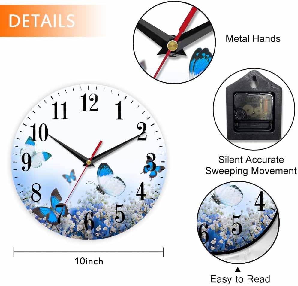 Mxocom Flower Bouquet Wall Clock Butterfly and Blue White Hydrangeas 10 Inch Silent Non Ticking Battery Operated Clock Vintage Round Clock for Living Room Bedroom Bathroom Office Decor