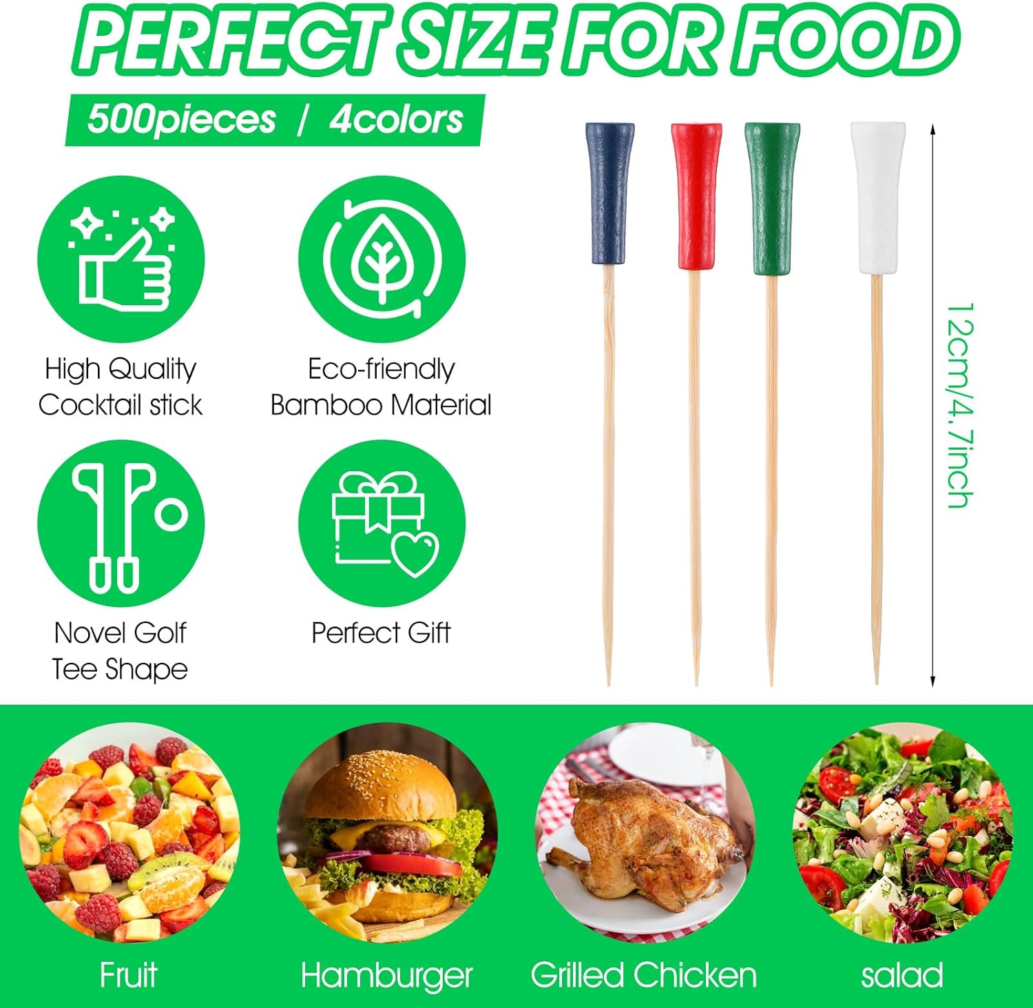 500 Pcs 4.7 Inch Golf Tee Picks for Appetizers Golf Toothpicks Decorative Golf End Sports Bamboo Fruit Sandwich Cocktail Picks for Golf Party Decoration Supplies Catered Events (Multicolor)