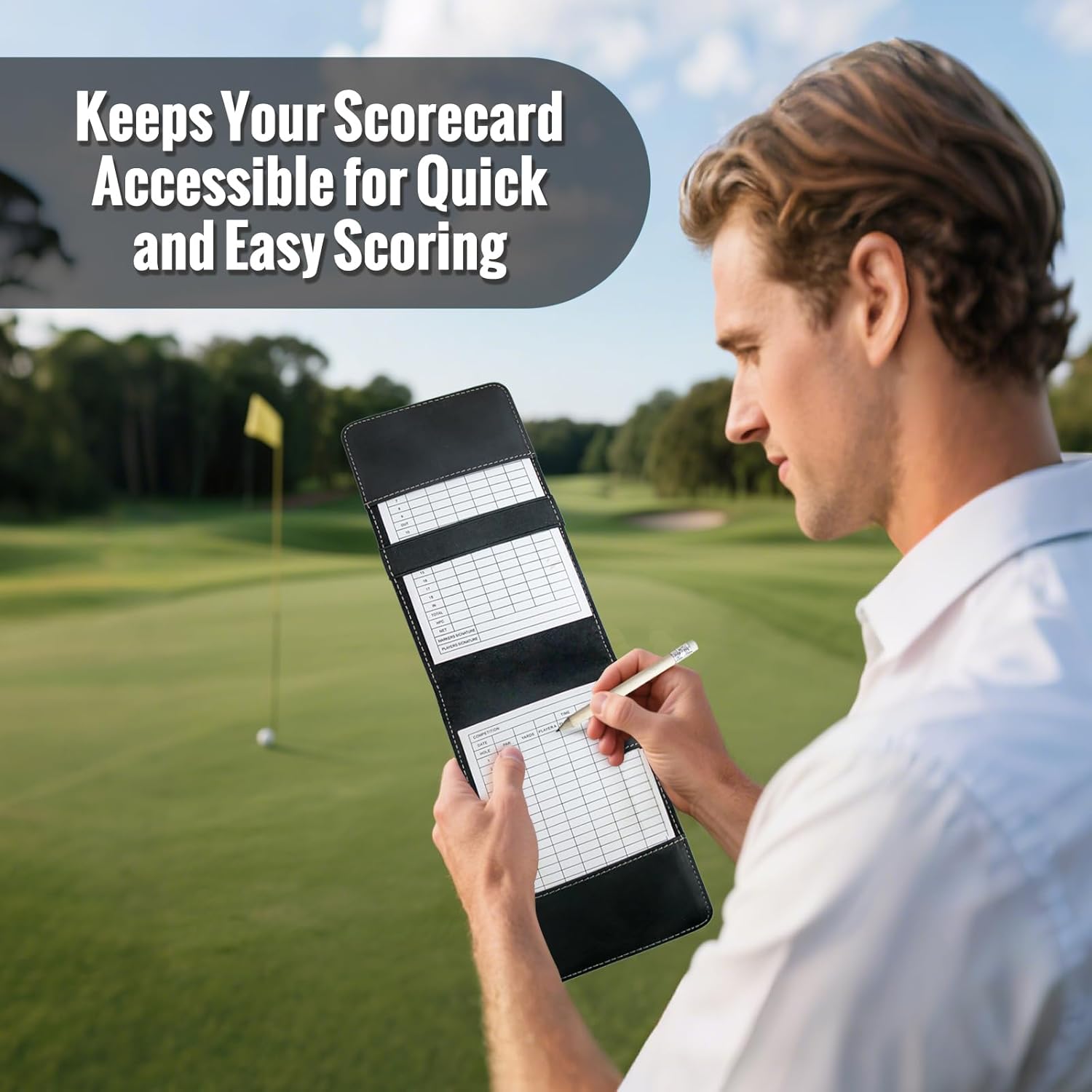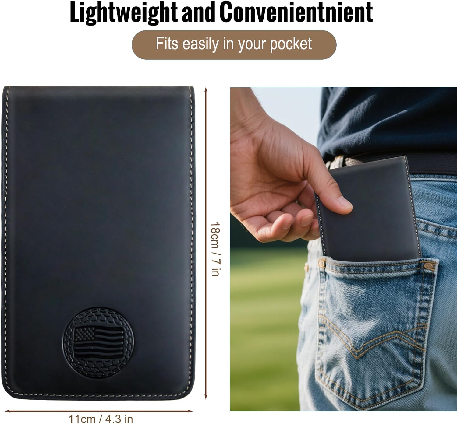 - Compact & Convenient Golf Accessories for Men Gift:7.09x4.33inches(18x11cm) Golf scorecard book holder comfortably fits in back pockets, compatible with most scorecards and yardage books. Dual-panel design provides ample space for recording scores with fellow golfers