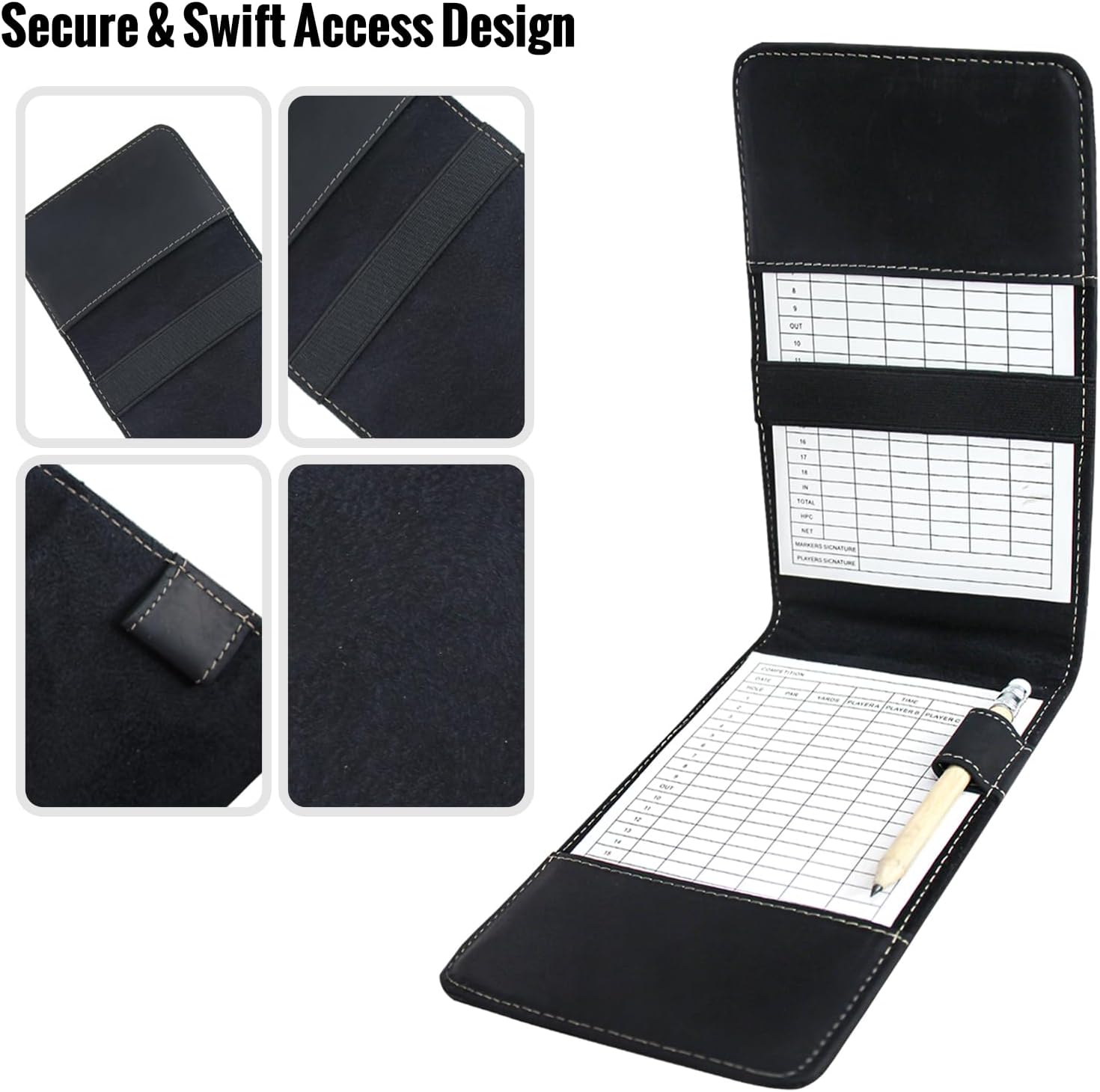- Secure & Swift Access Design:Features a central elastic band with top leather strap securing scorecards & yardage books, bottom-stitched panel framing to prevent slippage, and a dedicated elastic loop keeps pencils handy—all effectively protecting contents from sweat, dust, and scratches