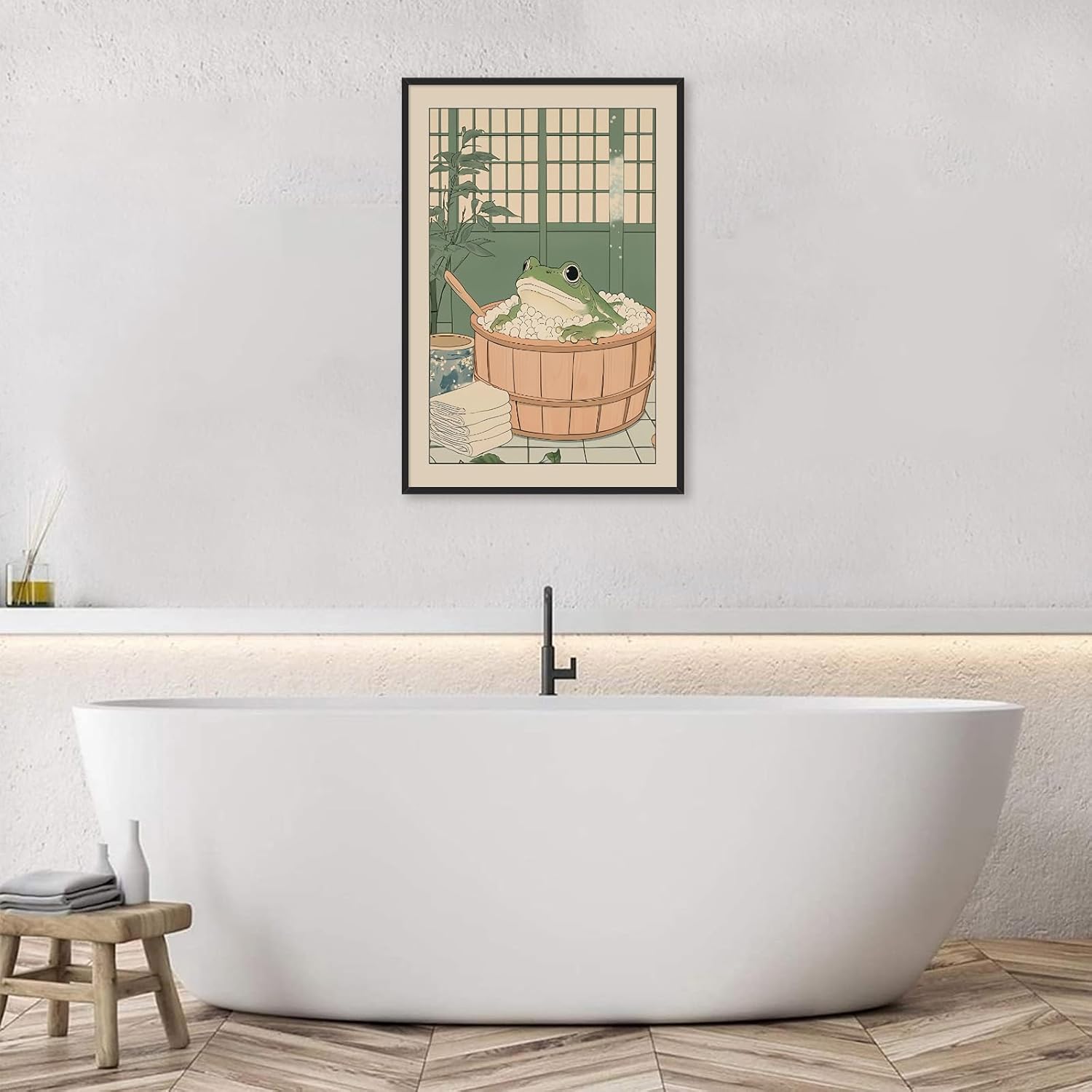 - Japanese Aesthetic Frog in Bathtub Poster: This funny bathroom wall art includes 4 sizes: 12x16in (30x40cm); 16x24in (40x60cm); 20x30in (50x75cm); 24x36in (60x90cm). The picture captures the healing moment of a frog taking a bath, creating the ultimate expression of Japandi style bathroom decor.