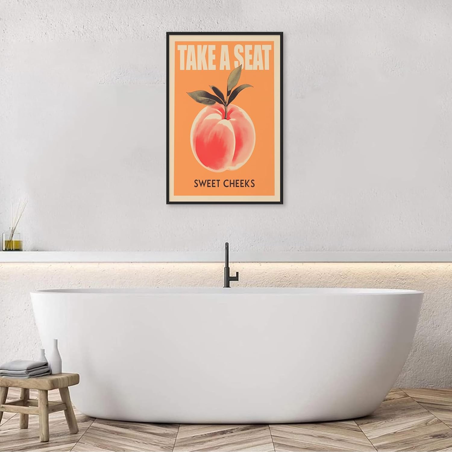 Take a Seat Sweet Cheeks Poster, Funny Bathroom Wall Art Peach Bum Art Canvas Print, Minimalist Preppy Orange Pink Wall Decor for Dorm Toilet 16x24in Framed
