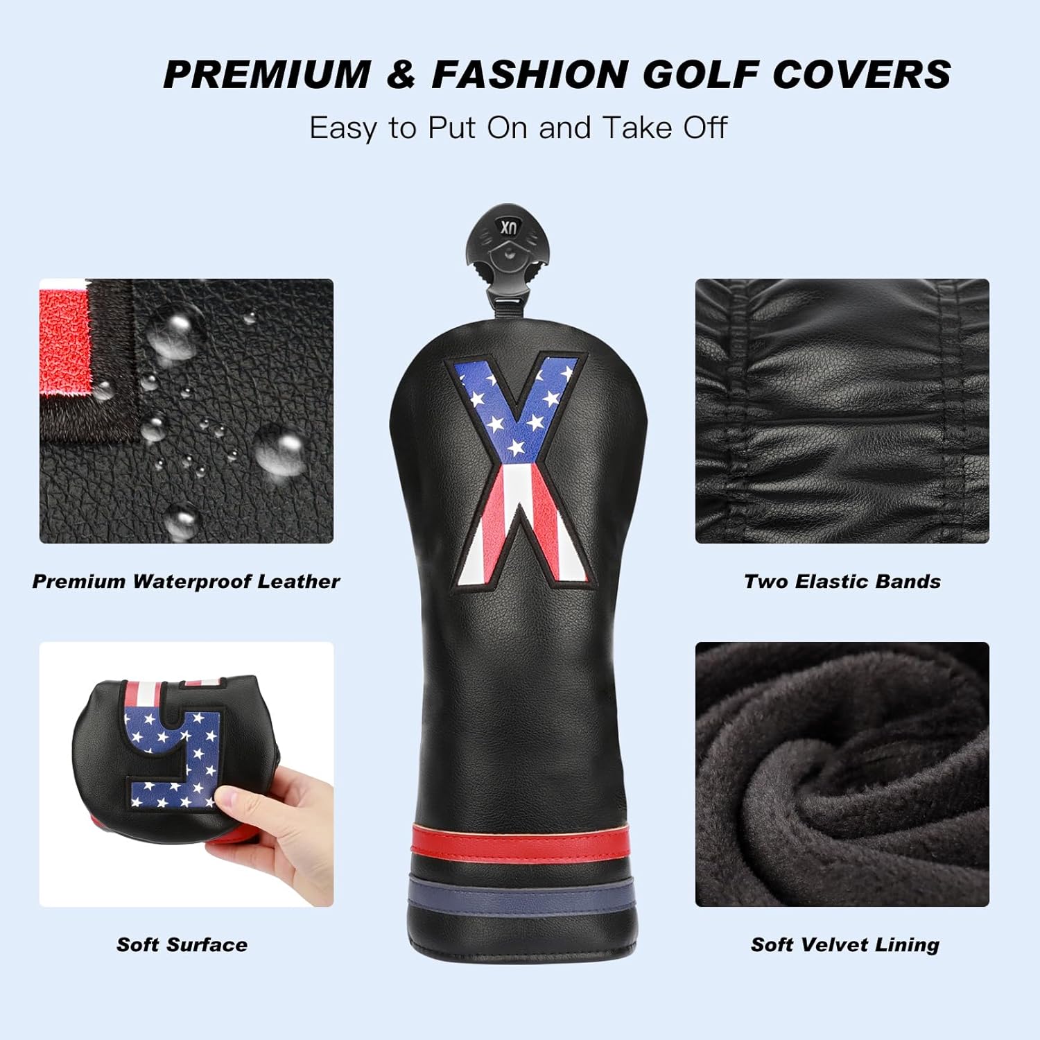 Golf Head Covers, 4pcs or 1pc USA Stars and Stripes Golf Club Covers for Woods and Driver Fairway Hybrid, PU Leather Golf Club Head Covers for Men Women with Interchangeable Tags, Fits Most Golf Clubs