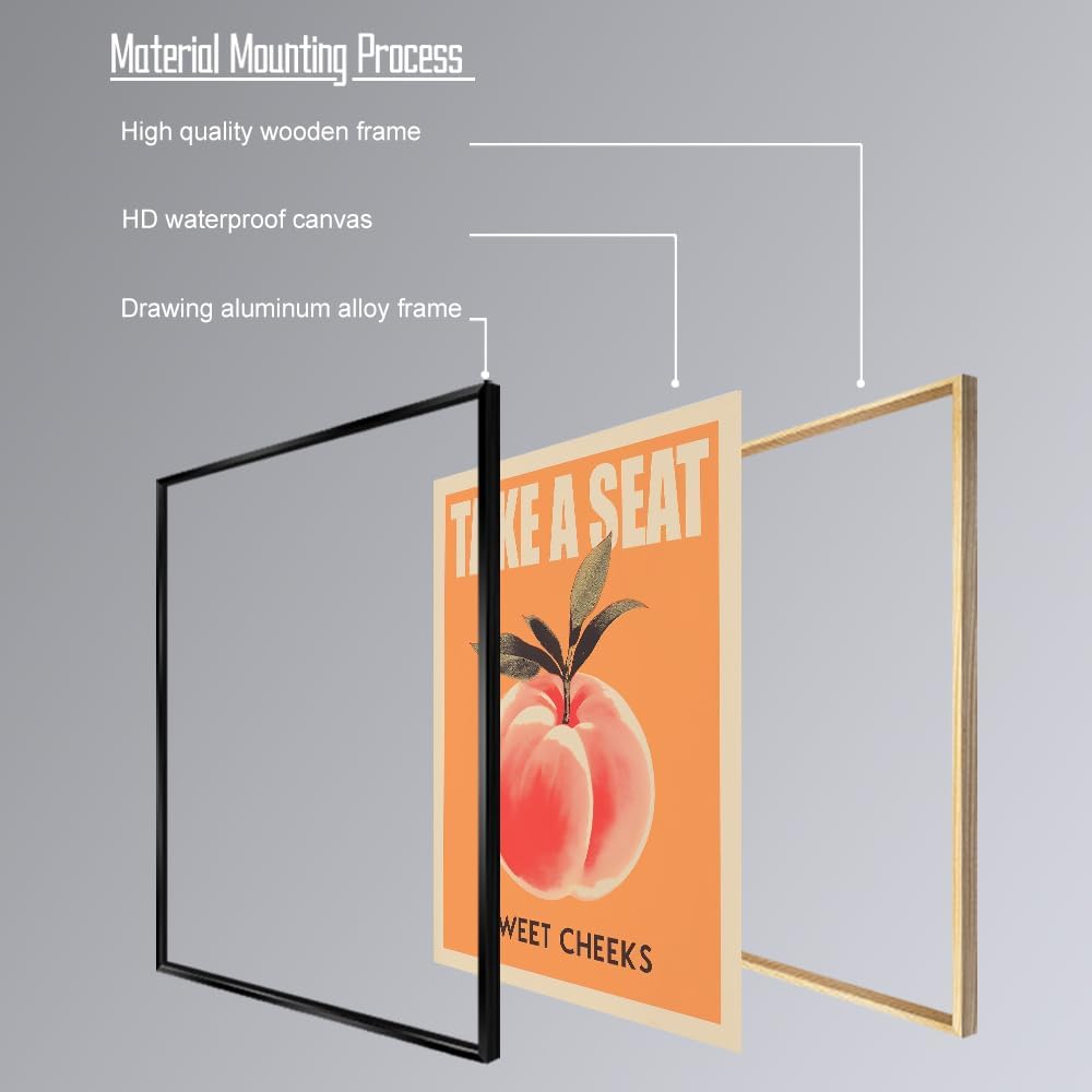 - Orange Bathroom Decor Wall Art: This funny bathroom wall art includes 4 sizes: 12x16in (30x40cm); 16x24in (40x60cm); 20x30in (50x75cm); 24x36in (60x90cm). Reshaping the bathroom aesthetics with the style of 70s rock posters, "Take a Seat, Sweet Cheeks" is paired with a playful peach pattern. It is not only the pinnacle of bathroom humor, but also a humorous counterattack against body anxiety.