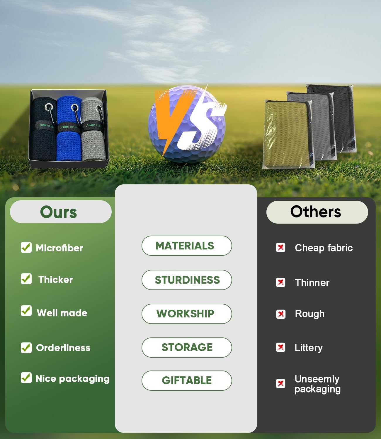 - 【Must Have Golf Accessories】Keeping clean and dry is one of the most important parts of winning a golf competition. Three golf towels of different colors are available for you to clean golf clubs, golf balls, golf grips and even your hands and body. You no longer have to use the same towel to wipe both your body and the dirty golf gear