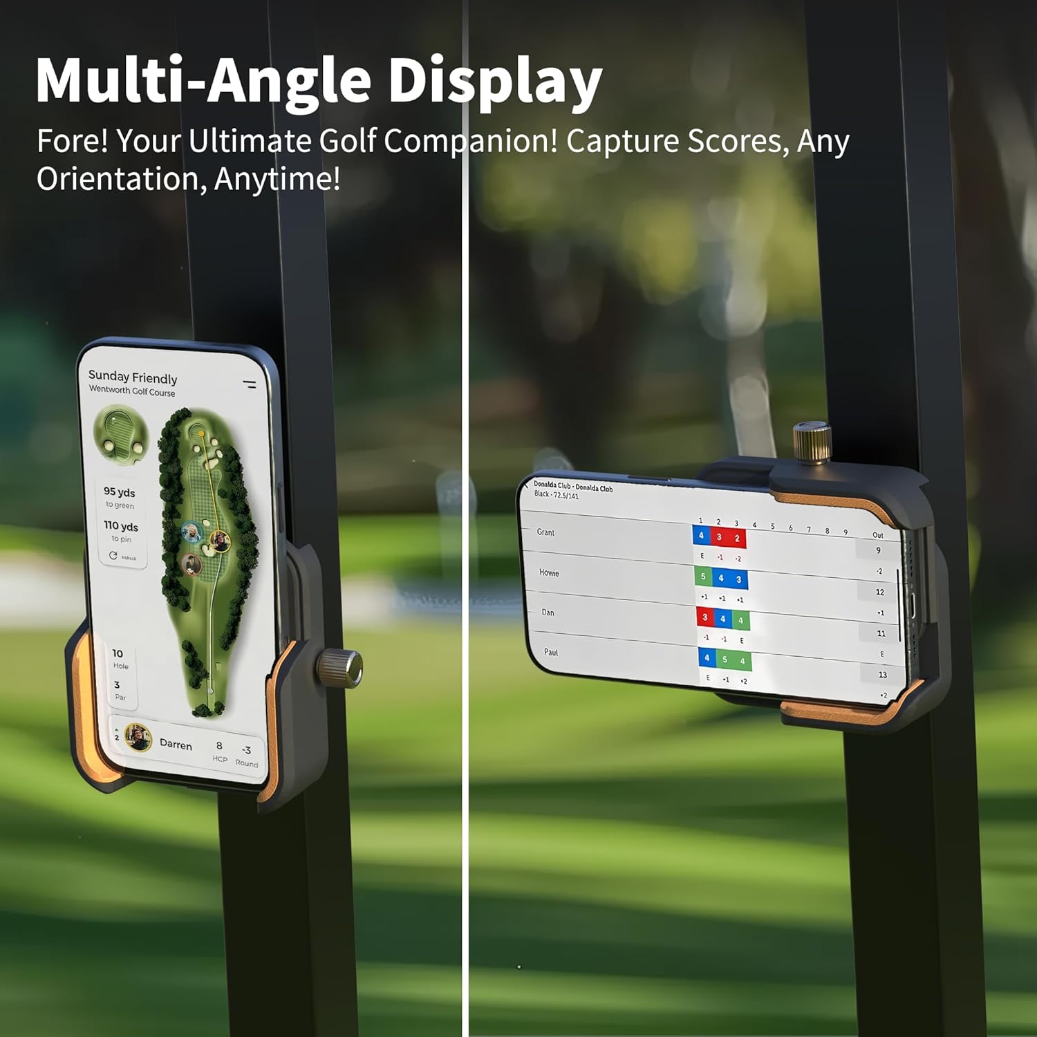 - 🔄 360° Adjustable Viewing Easily rotate for portrait or landscape viewing—perfect for GPS navigation, recording your swing, or checking scores mid-round.