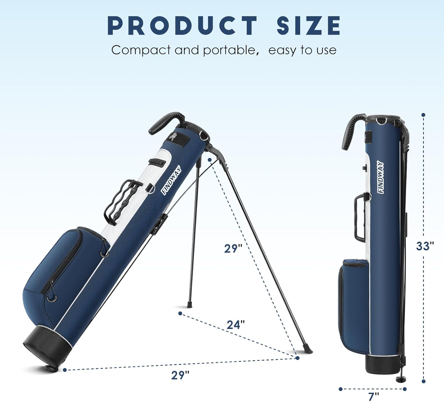 - 【Easy to Carry and Store】The innovative press-in stand provides instant stability on any terrain, this golf bag with stand is only 31.5 inches long, dimensions: 31.5" x 5.11" x 3.94", top opening is 4" x 5", equipped with easy-to-grab quick-carry handles and retractable support legs that automatically fold when the bag is picked up. The handles easily attach to a standard golf cart, the perfect balance of minimalist design and practical function.