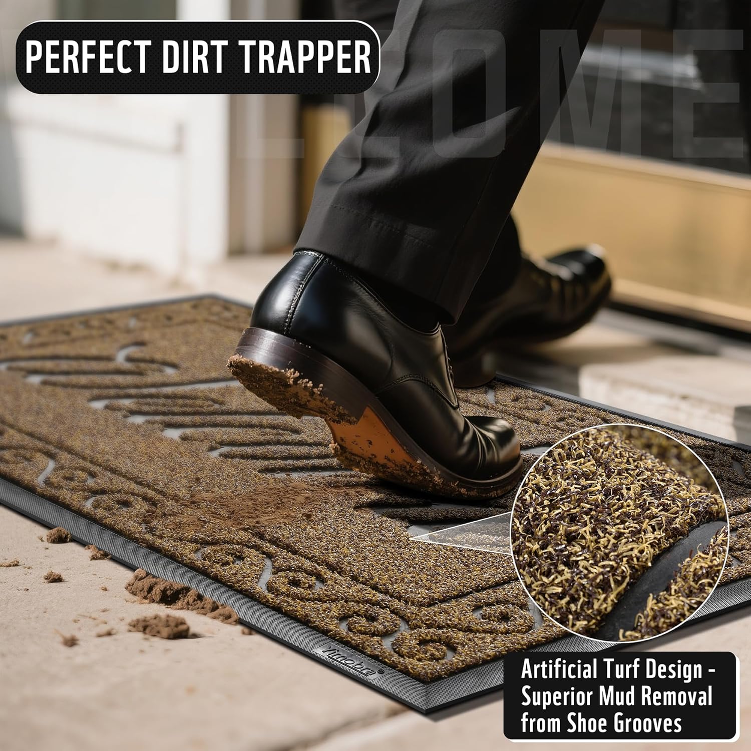- 【Perfect Dirt Trapper】: Yimobra welcome mat surface is made of high-quality artificial grass, compared to other common materials, this can be more effective in trapping dirt, dust, mud, sand, or other debris and preventing them from entering the room, thus keeping your home clean and tidy. The Sturdy rubberized beveled edges also trap water, preventing excess water from splashing onto the floor!