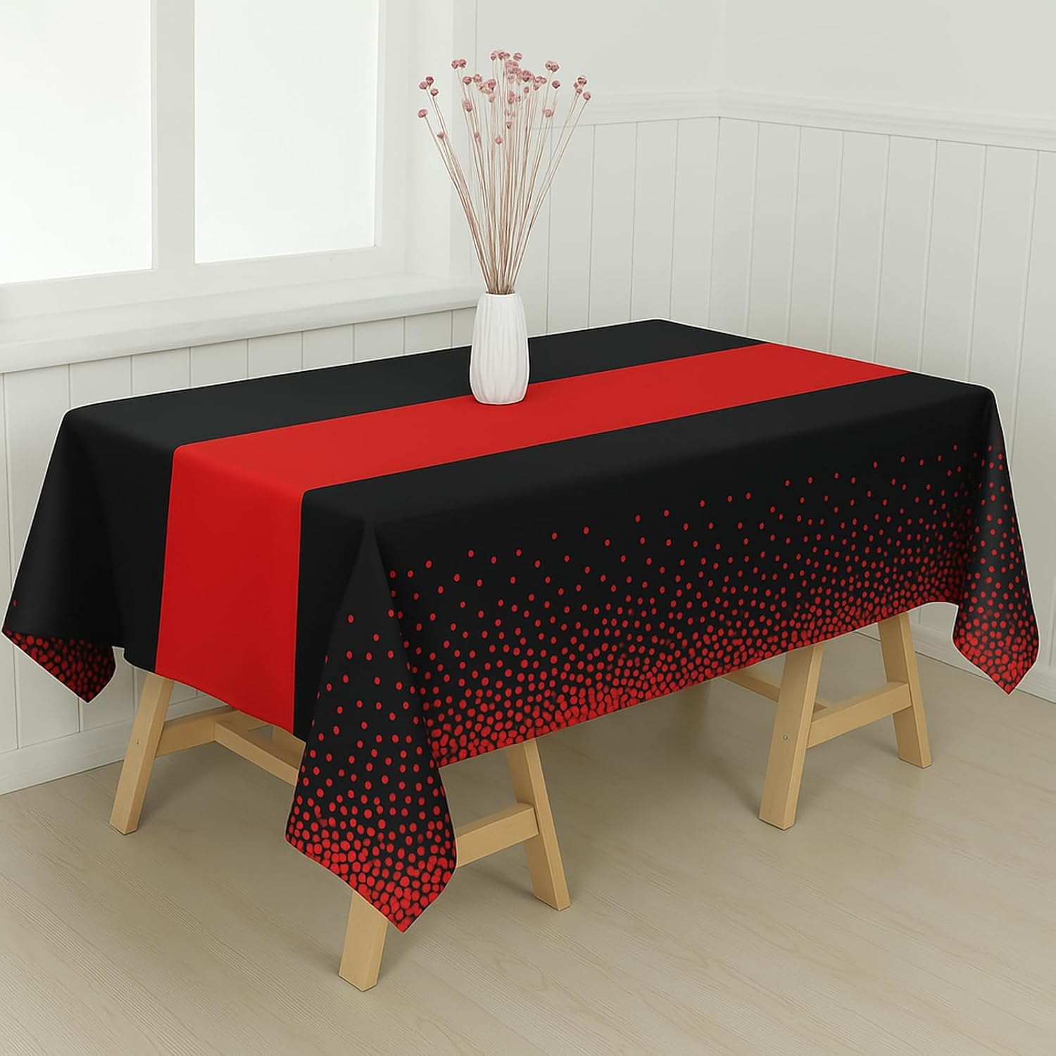 - 2IN1 Table Linens: Designing a black and red confetti dot plastic tablecloth and a red table runner together, it is more convenient and more environmentally friendly than a traditional tablecloth and table runner.