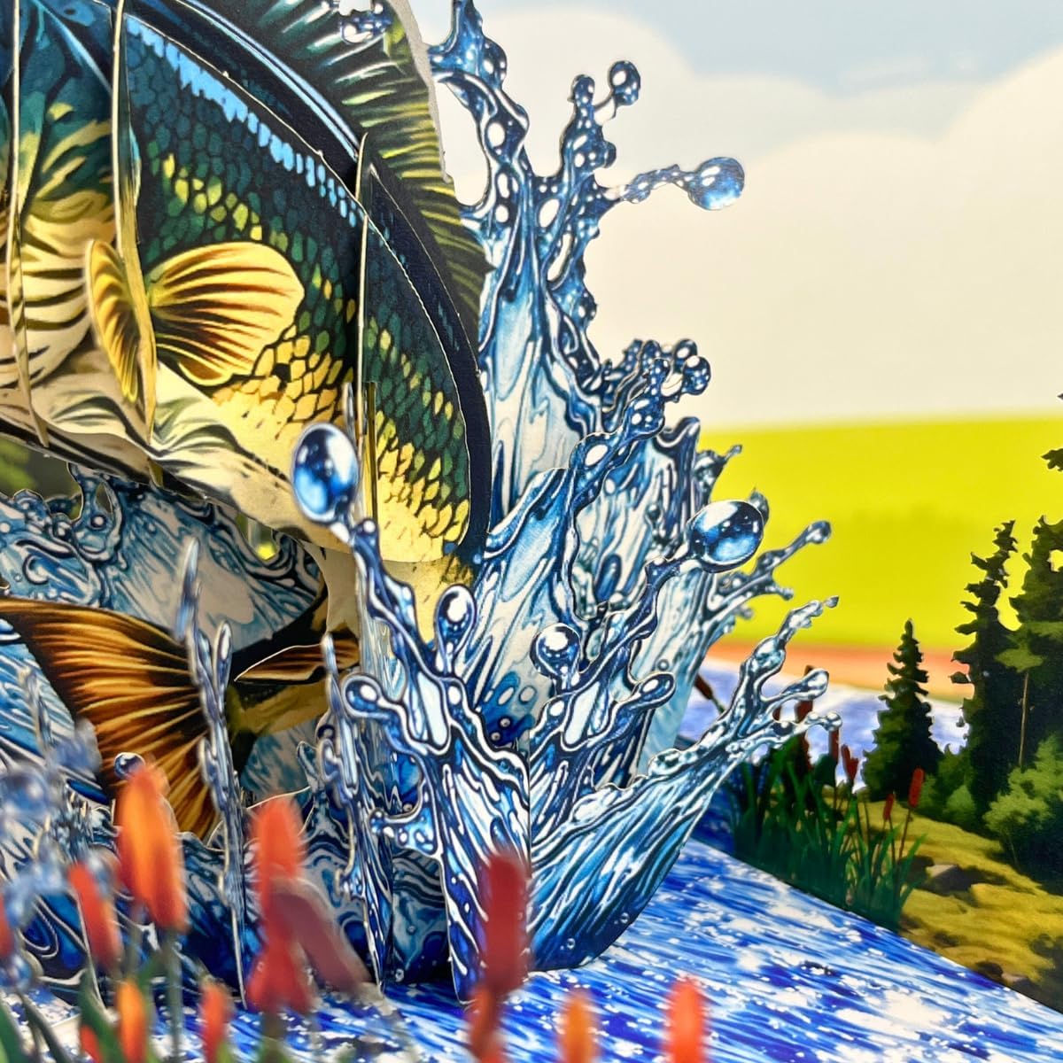 - Incredible 3D Pop-Up Fishing Scene – Features a beautifully detailed bass fish leaping from the water, tranquil water, and lush nature elements that bring the card to life