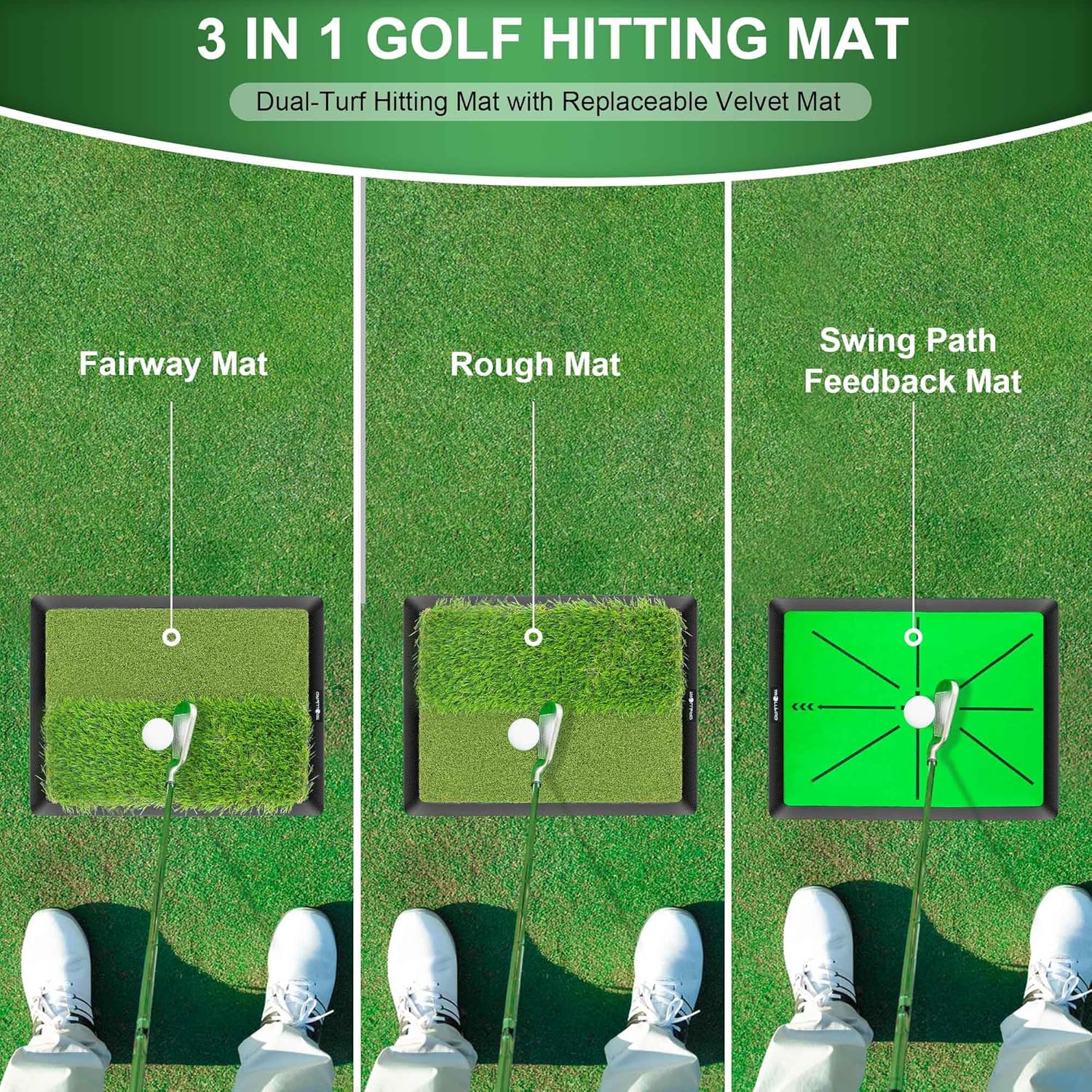 - Package Included:Golf strike mat rubber base*1,Dual-Turf Golf Hitting Mat*1,Replaceable velvet mat *1