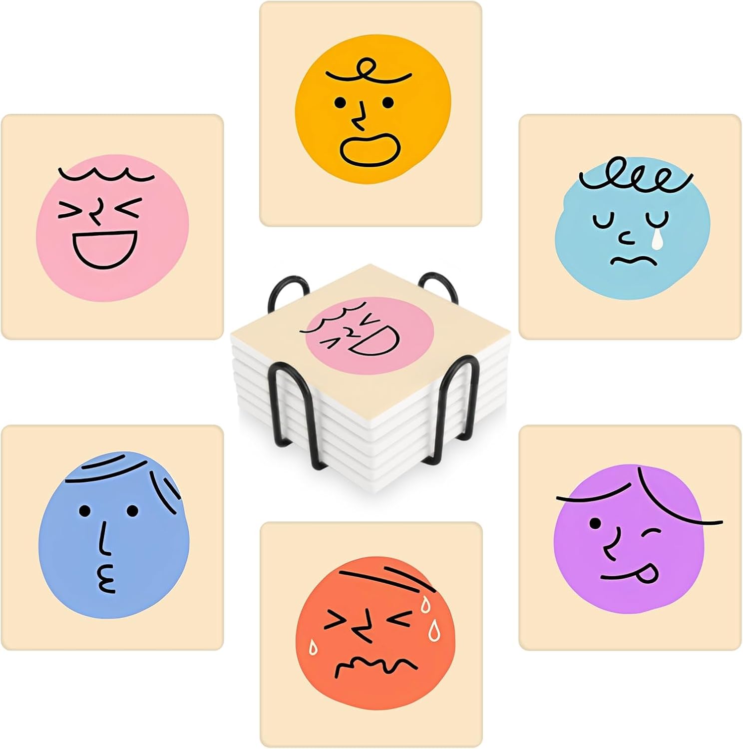 - Nice Pattern Design - Our square ceramic coasters showcase minimalist designs in the expressions of cartoon characters of different colors and moods, allowing you to express your personality and unique sense of style. Perfect for enhancing the holiday atmosphere, they make an ideal addition to the dining table decoration.