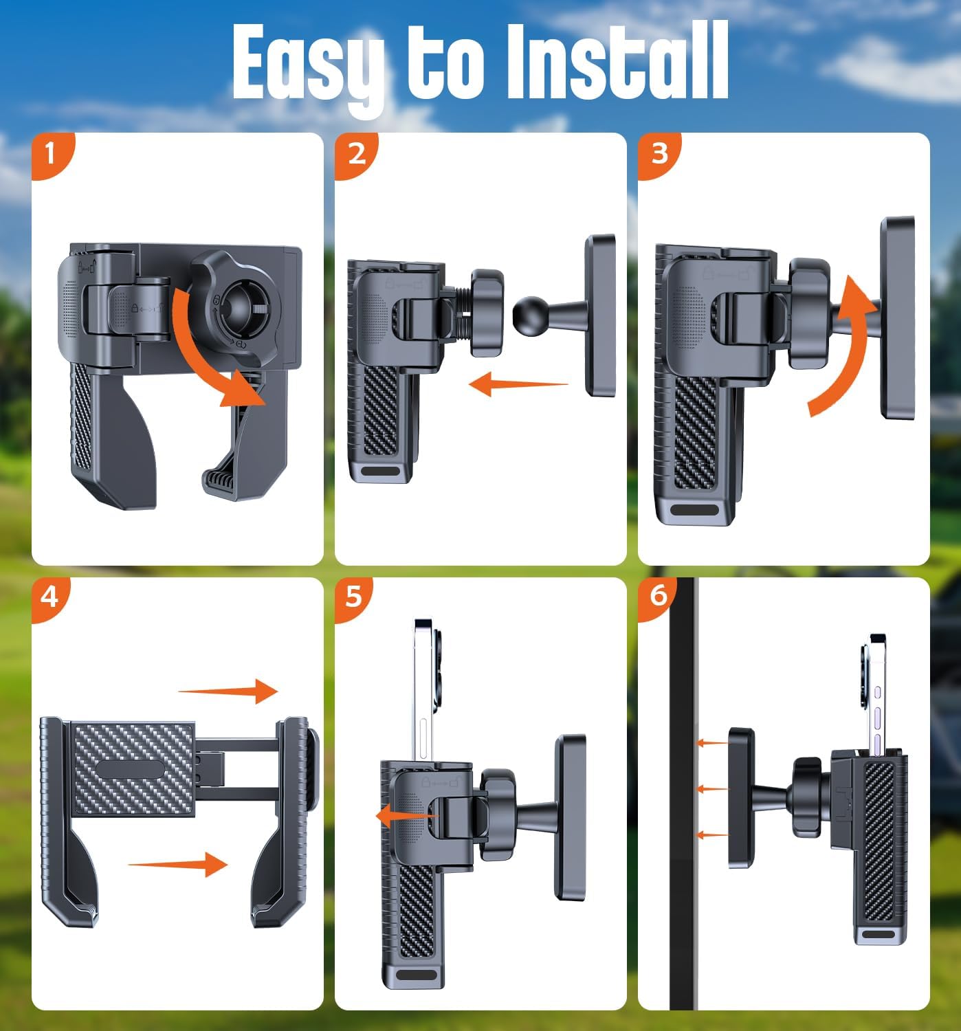 - 【Super Steady with N52 Magnet】Just attach this magnetic golf cart phone holder on and go. It can be securely attached to a golf cart. Even when driving on bumpy roads, the phone holder and phone will not fall off.
