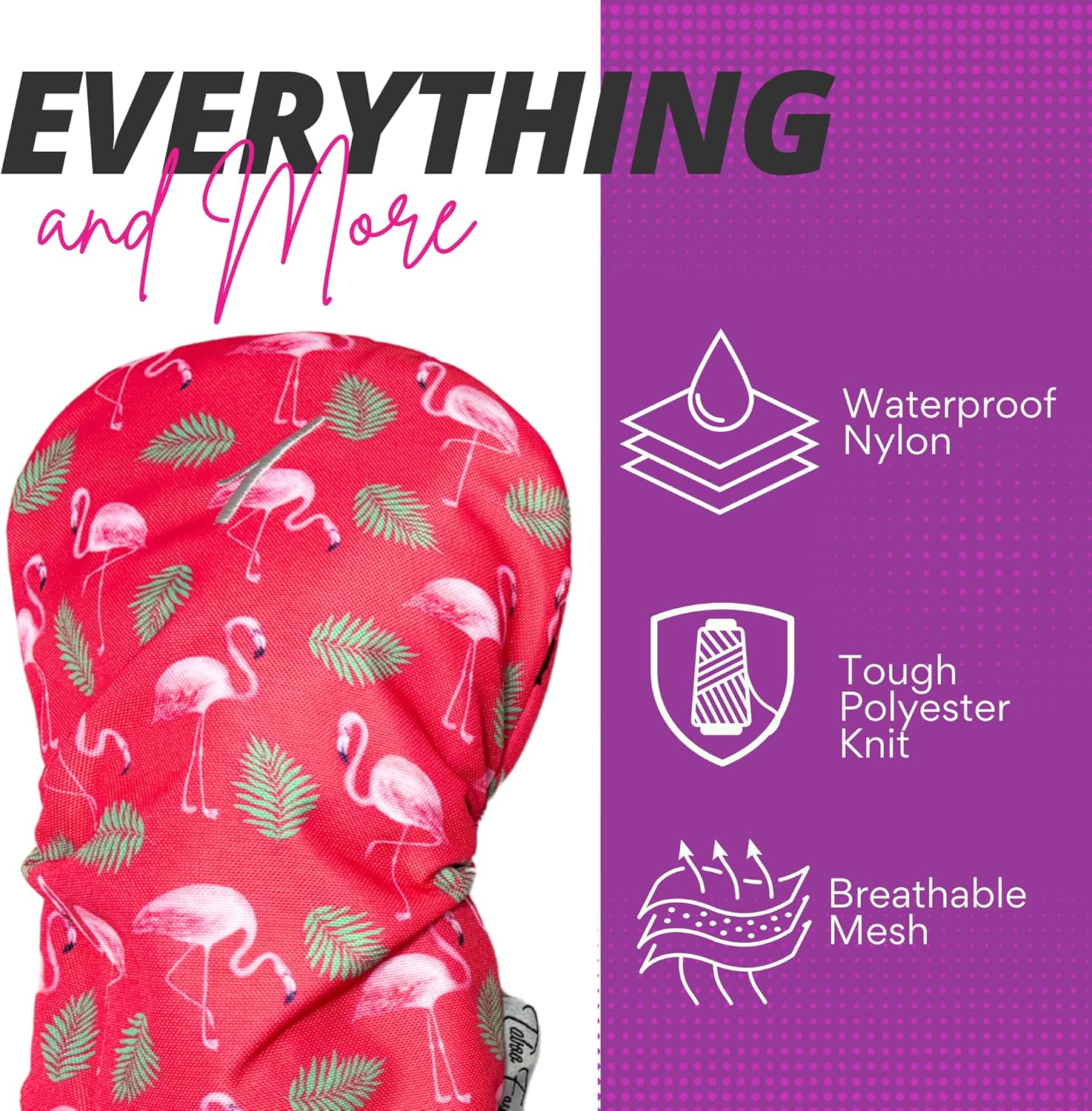 - HEAVY DUTY, WATERPROOF PROTECTION: Crafted from a premium blend of waterproof nylon, polyester knit, and breathable mesh, these ladies golf club covers shield clubs from rain, dew, and everyday wear. A soft velour lining provides extra cushioning to prevent dents, scratches, and damage during transport.