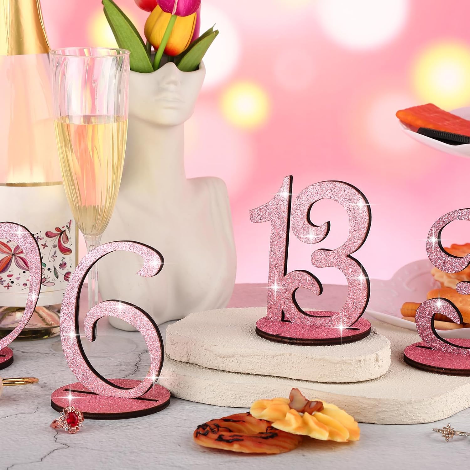 Glitter Table Numbers 1-25 Wooden Table Numbers for Wedding Reception Standing Seat Place Cards with Holder Base for Wedding Party Event Catering Receptions Banquets(Rose Gold)