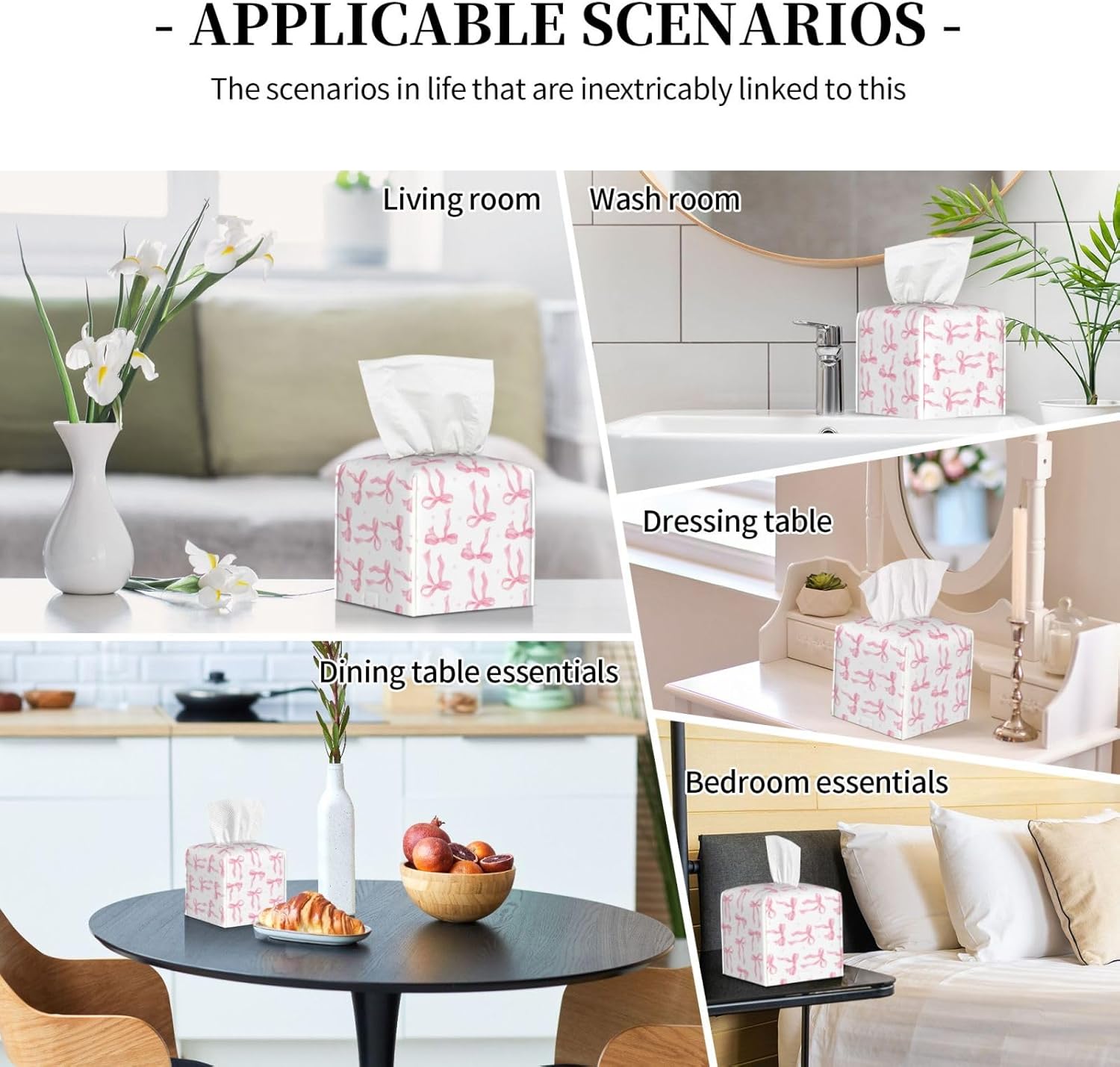 Pink Bow Tissue Box Holder Paper Organizer, PU Leather Tissue Case Cover, Bow Decor for Bathroom, Kitchen, Car