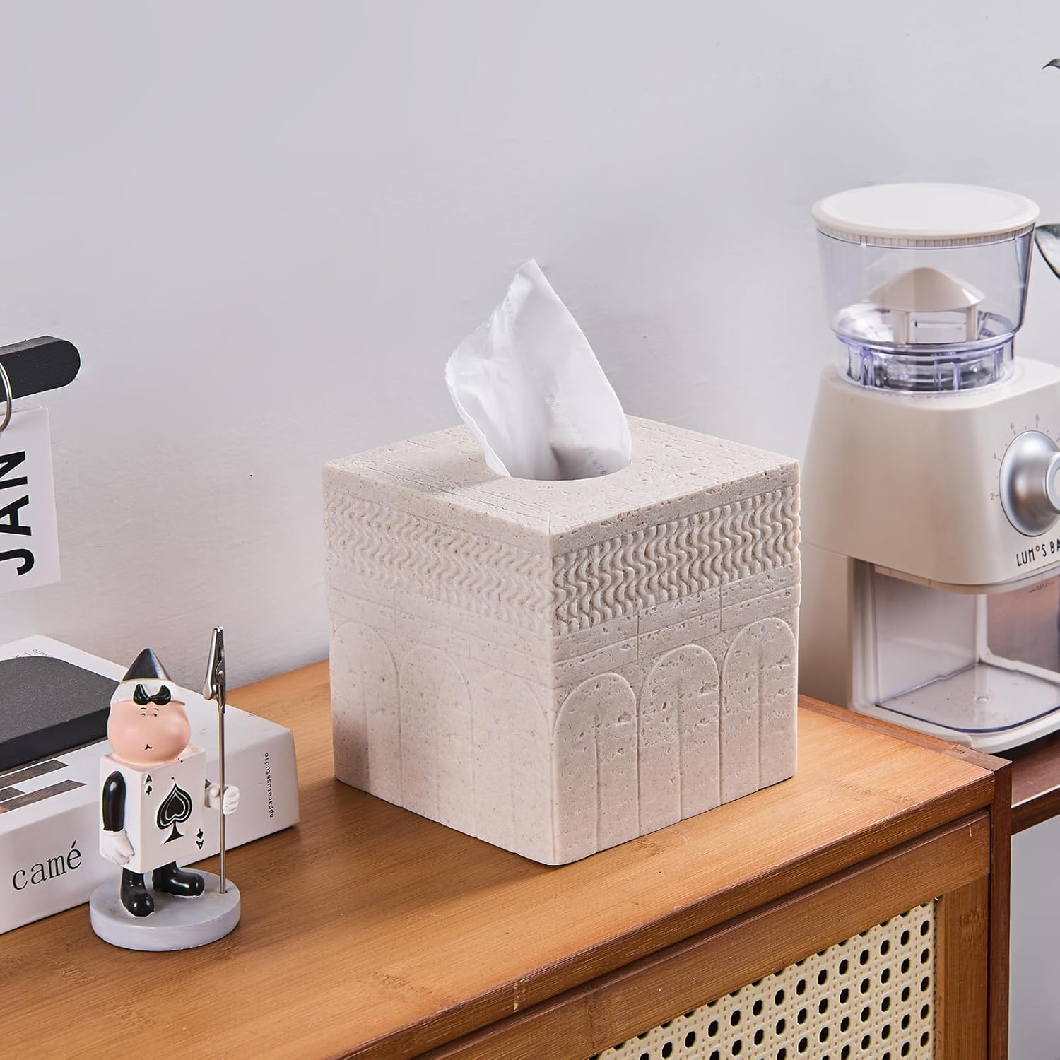 Sandstone Carved Pattern Tissue Box Cover – Modern Resin Cube Holder for Bathroom, Bedroom, Office – Decorative Square Tissue Box for Countertop, Nightstand, Vanity & Desk – Heavy&Sturdy