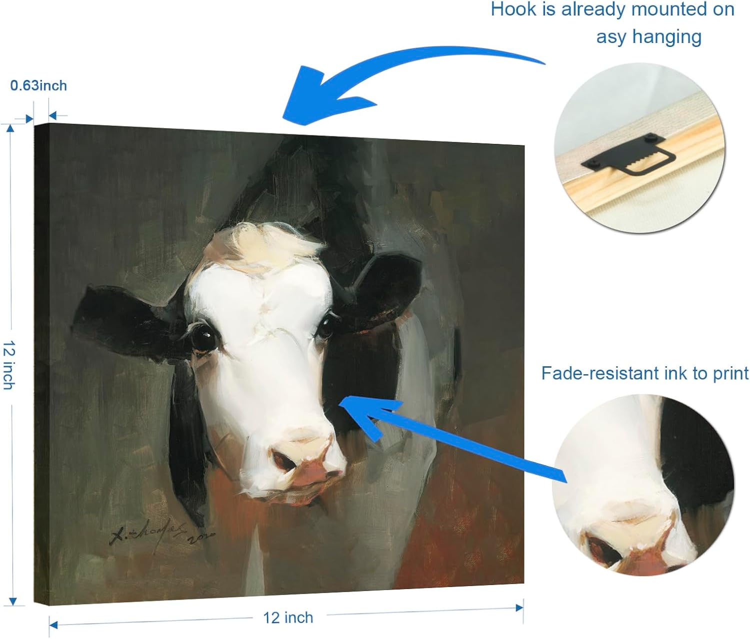 - 【12"x12" Framed Cow Canvas Art】This cow canvas art print is from the original farm series of oil paintings by artist Thomas Xie. HD printed on heavyweight cotton canvas with solid wood frame - Idea for farmhouse wall displays.