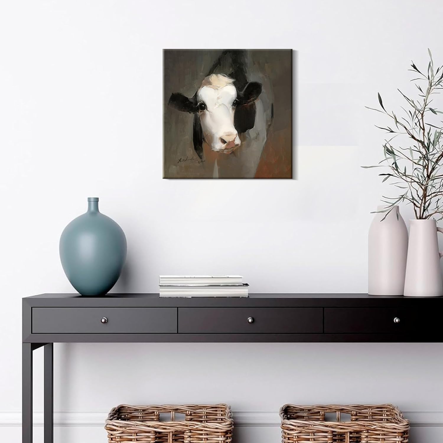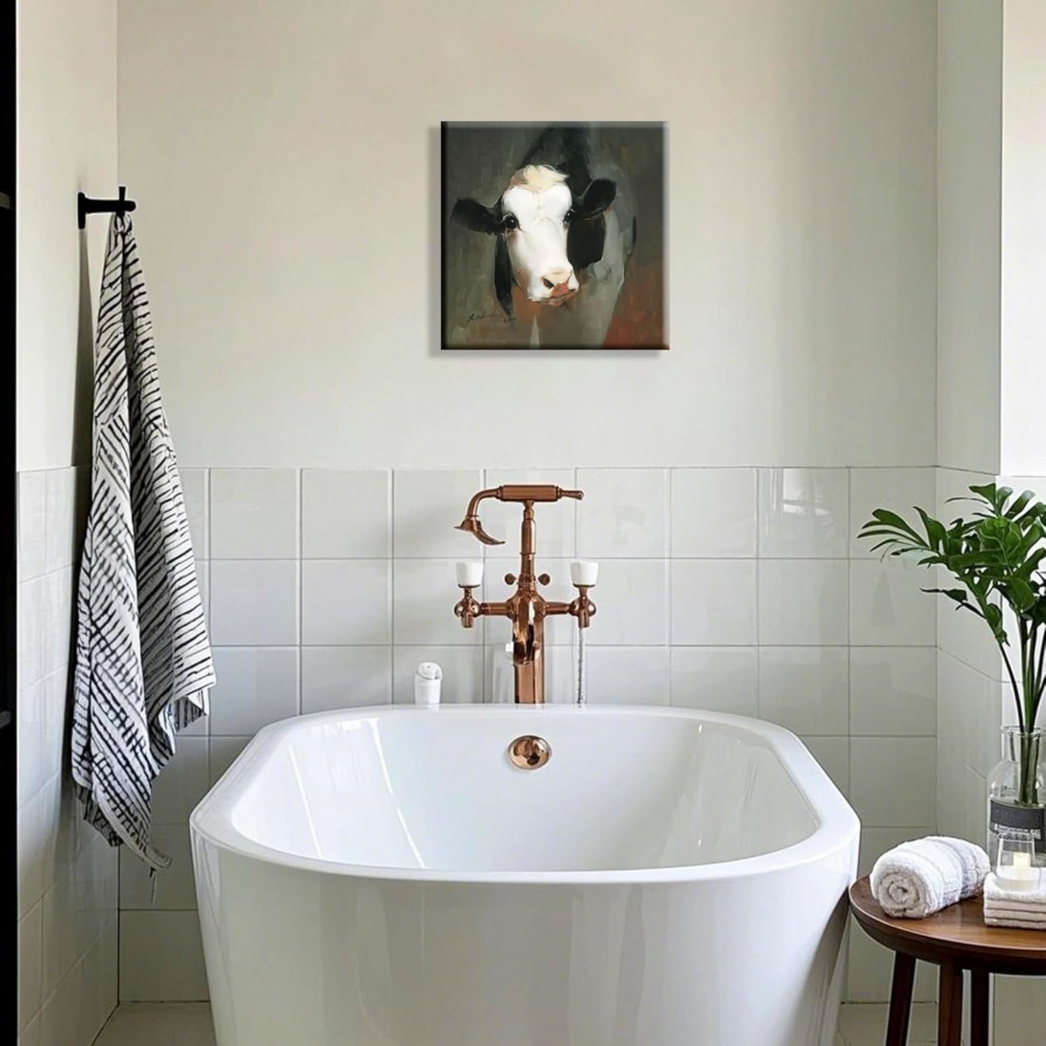 JZLDZS Farmhouse Cow Canvas Wall Art, Rustic Black & White Cow Painting Print, Country Decor for Kitchen Living Room Bathroom Bedroom, Gallery Wrapped 12x12 Inch Framed