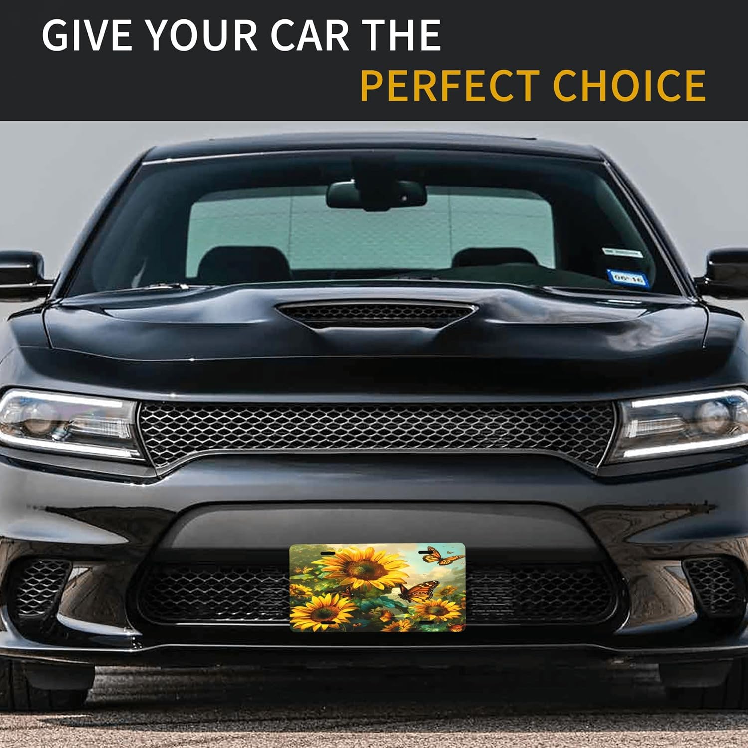Front License Plate for Car Designs Sunflower Flower Butterfly Stainless License Plate Cover Holder for Men Women Metal Aluminum Decorative Accessory Vanity Tag Standard 6 X 12 inch (4 Holes)