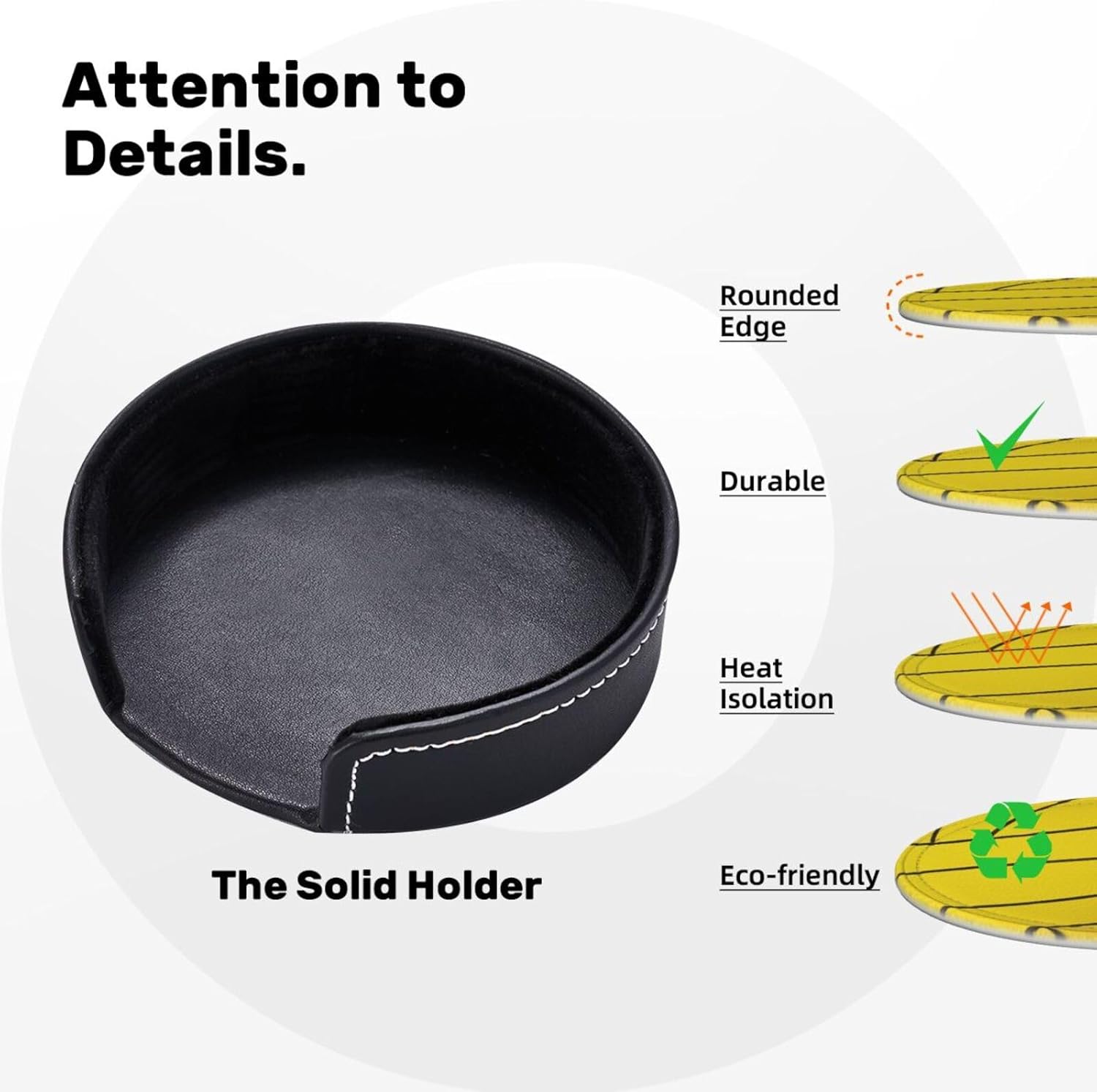 - 【Selected Materials】6 pcs drink coasters with holder are soft and tough. Leather gives the coasters a unique texture. The surface is easy to clean. Lightweight and easy to store.