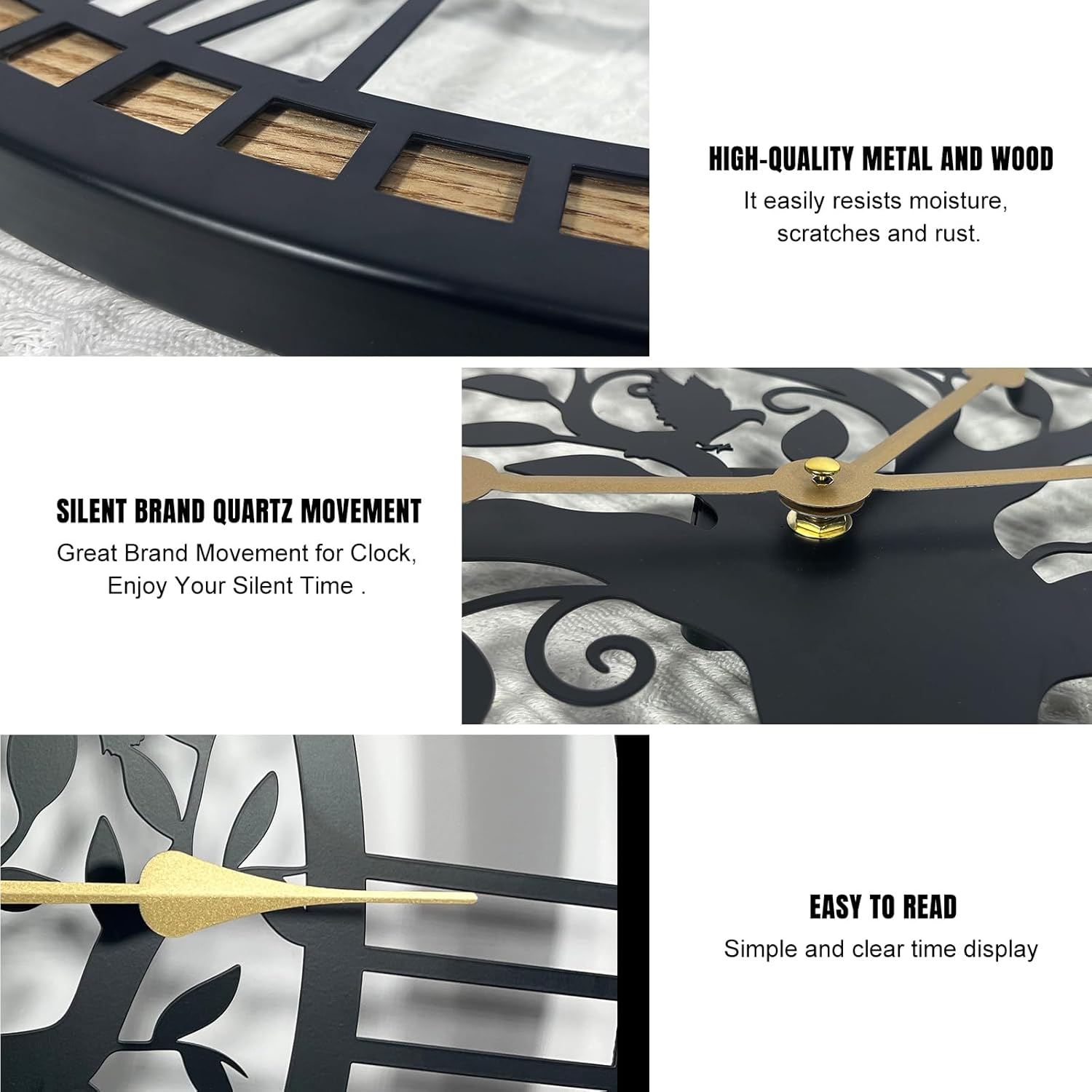 - 【High Quality Durable Large Wall Clock】:This black metal wall clock uses a thickened iron metal frame and a natural solid wood dial, and is crafted with double protection - the frame is treated with anti-rust paint, and the wood grain surface is covered with wear-resistant varnish, which can easily resist moisture, scratches and rust.