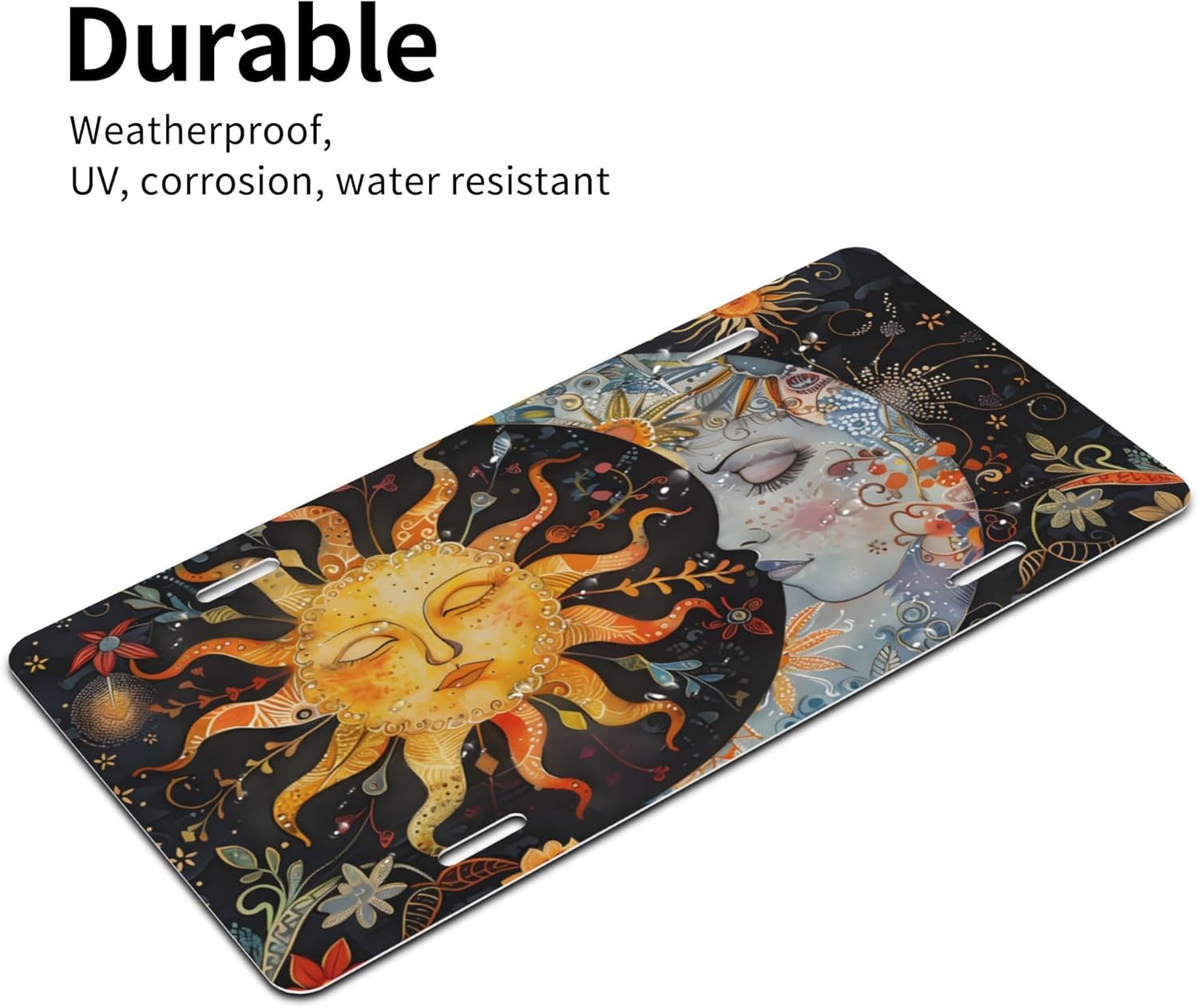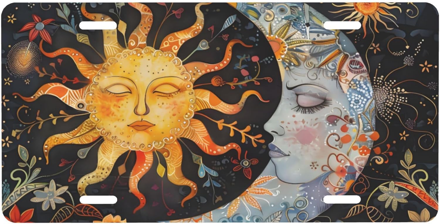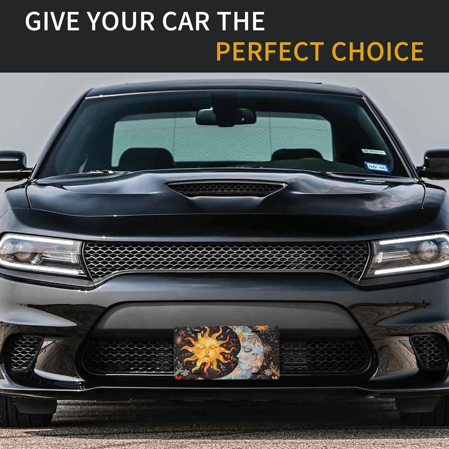 Front License Plate for Car Designs Abstract Sun Moon Flower Stainless License Plate Cover Holder for Men Women Metal Aluminum Decorative Accessory Vanity Tag Standard 6 X 12 Inch (4 Holes)
