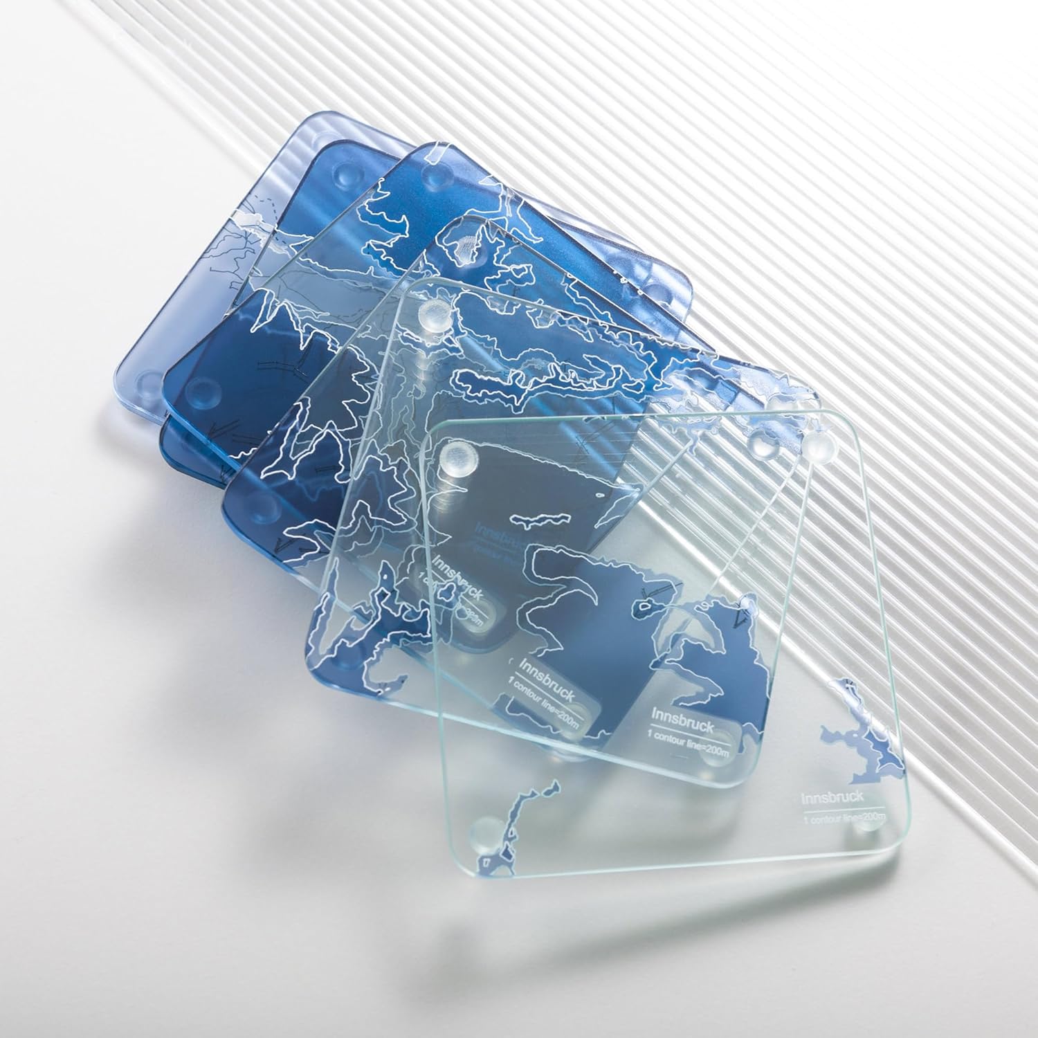- 3D Contour Map Glass Drink Coasters of Mountains, Ski Resort:O3 Design Studio's original 3D contour coaster distributes contour lines on six coasters, making them stacked up to create a three-dimensional mountain。 Compared to printed maps, you can more clearly understand the relationship between roads, rivers, mountain cable cars and contour lines.