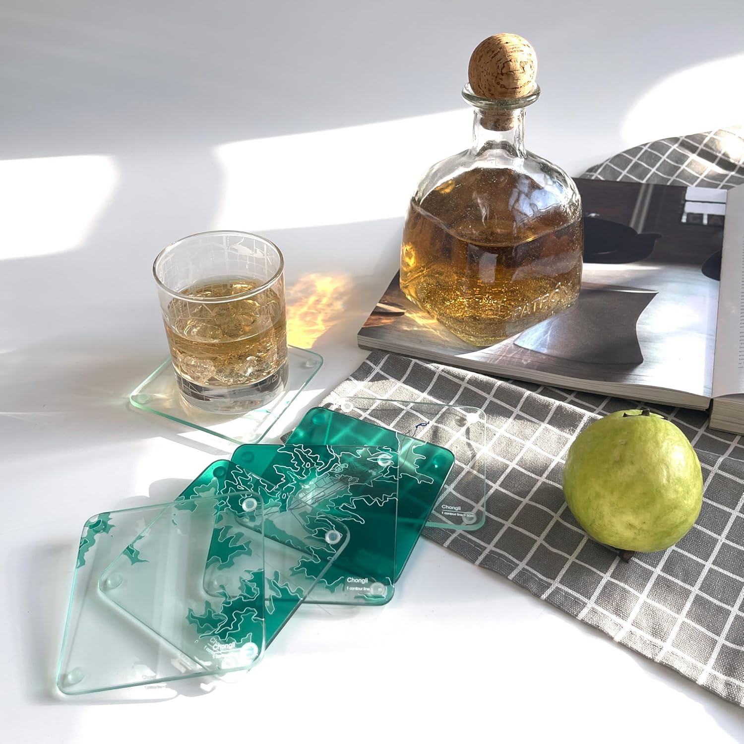 - Materials:Made from tempered glass, the clear coasters are smooth in surface, easy to clean. These simple but elegant glass coasters are heat-resistant and will help you protect your tables from stains. Special rubber feet are added to the bottom to prevent them from slipping. Each set of coasters comes with an acrylic coaster holder.