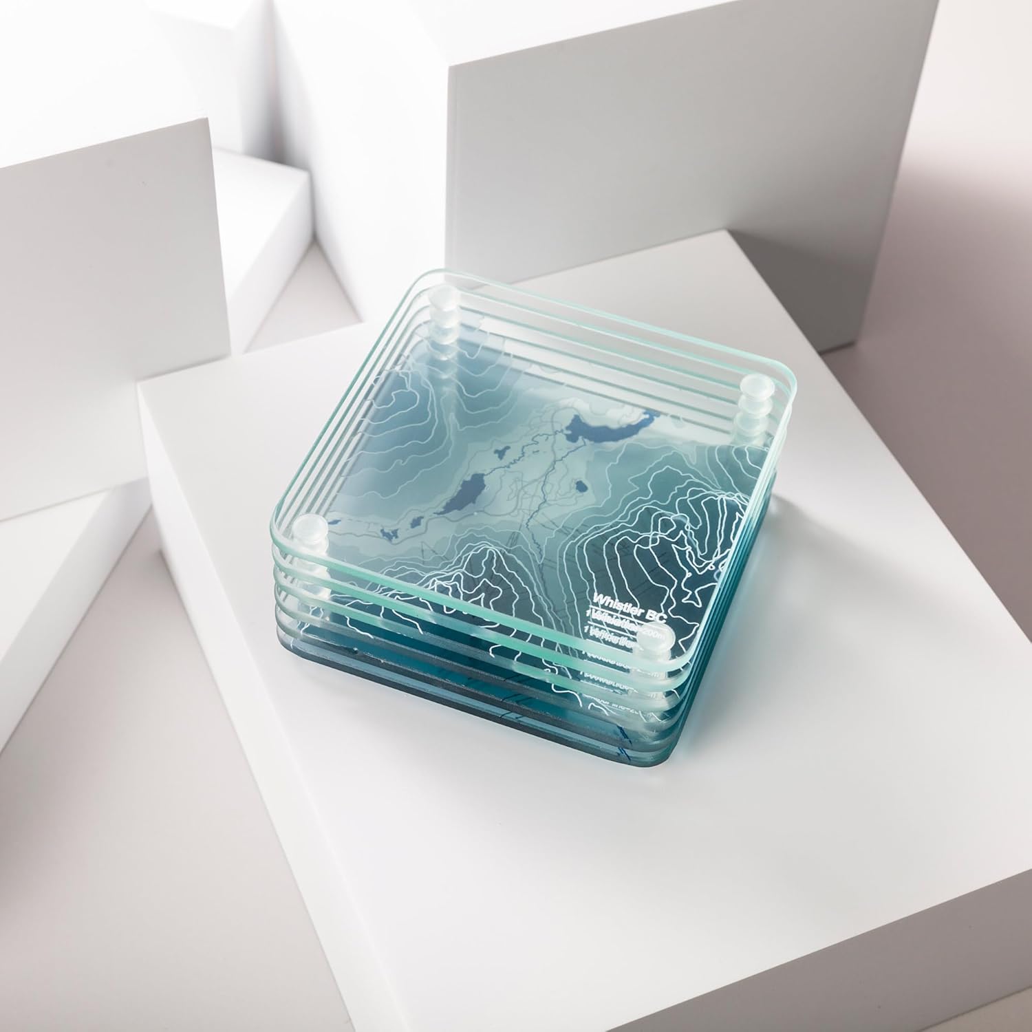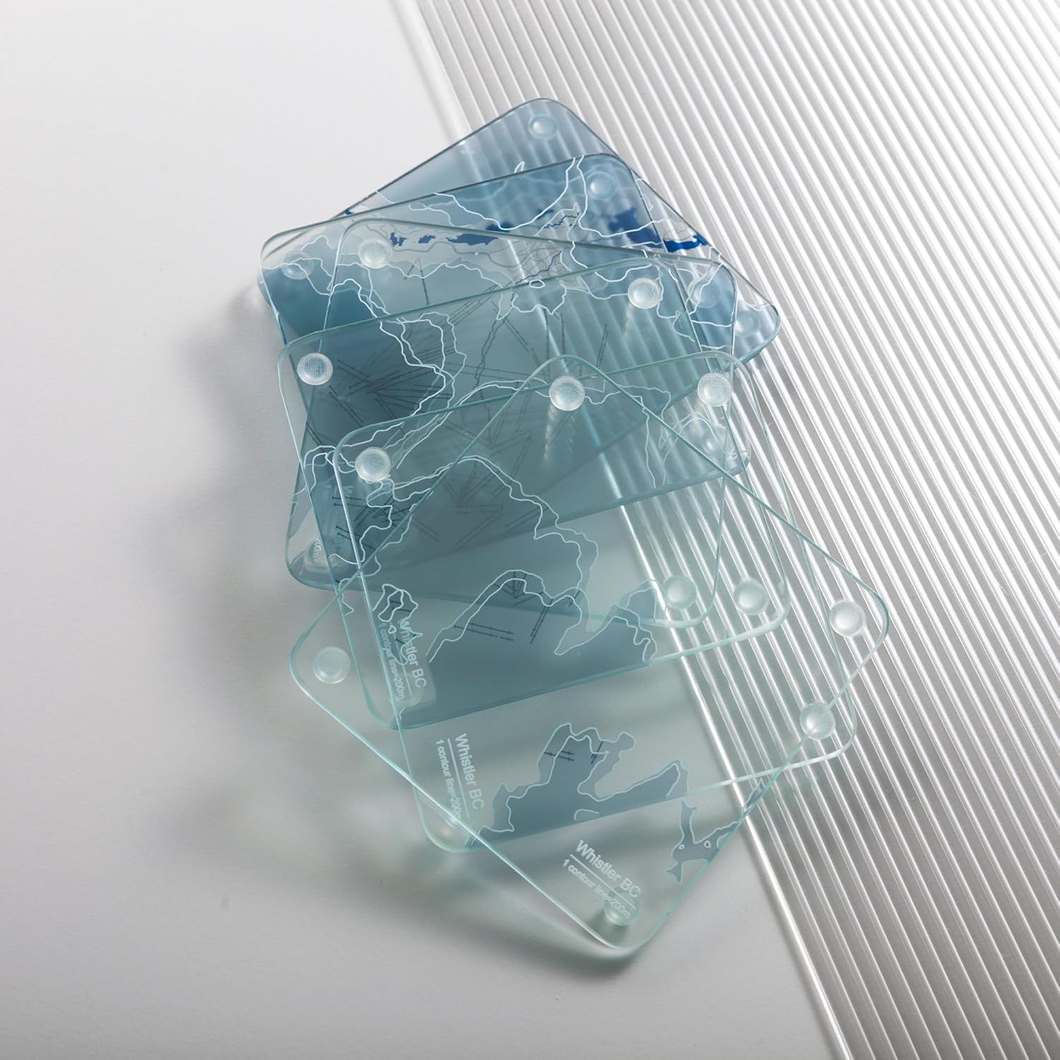 Whistler, BC 3D Contour Map Glass Drink Coasters of Mountains, Ski Resort, Set of 6 with Holder, Housewarming Birthday Gifts, Home Decor