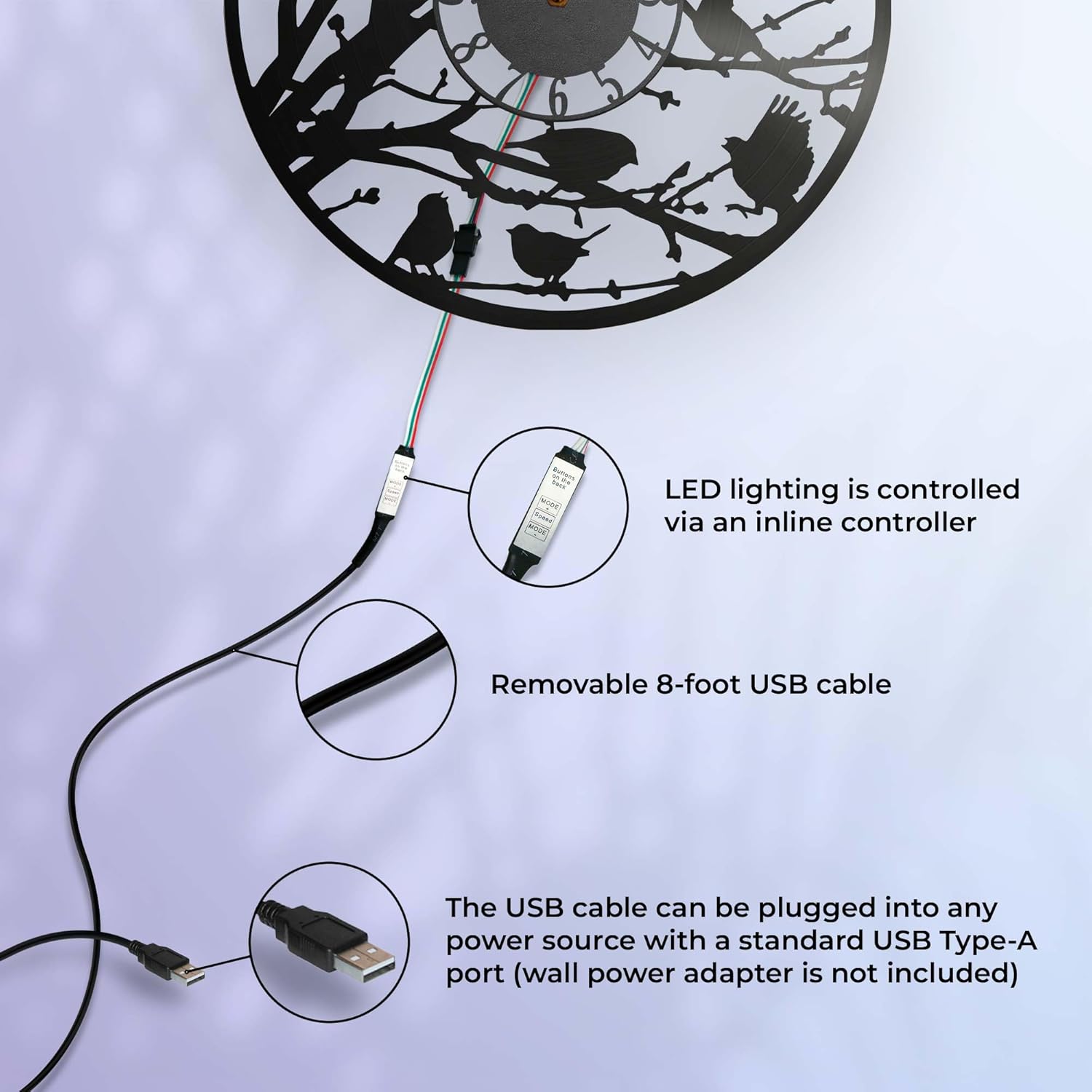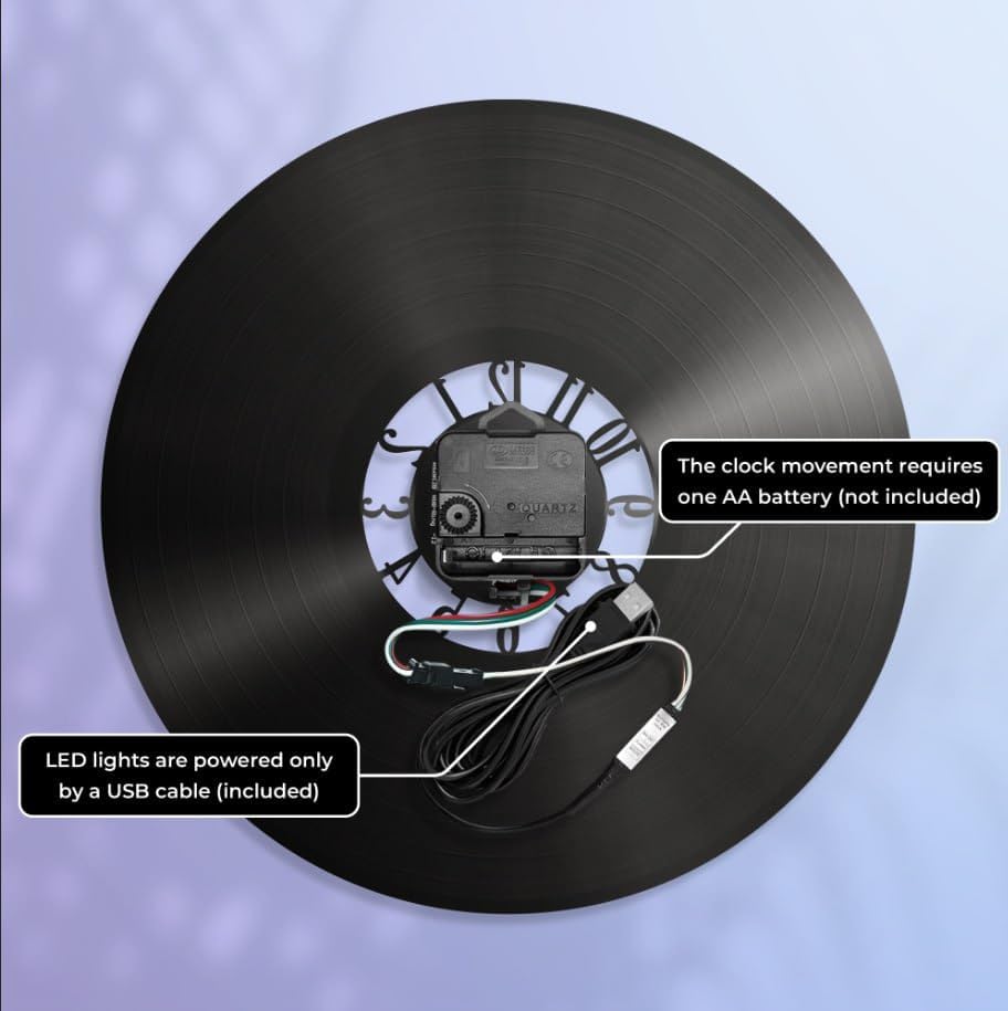 - Power Source: 1 AA battery is required for the clock movement to operate (not included) while the LED lights are powered only by a removable 8-foot USB cable (included). The USB cable can be plugged into any power source with a standard USB Type-A port. Wall power adapter is not included.