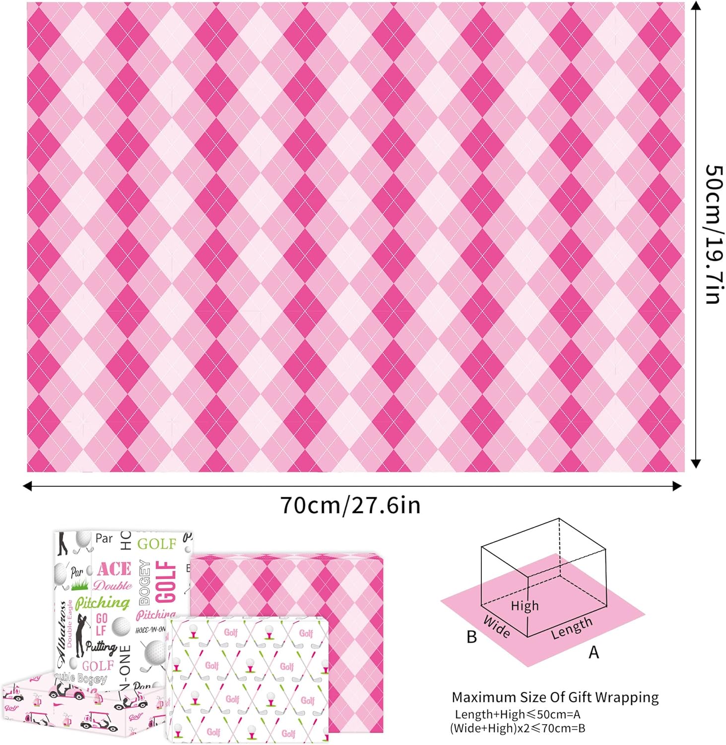 EoBeCy Pink Golf Wrapping Paper for Women Girls, 12 Sheets Folded Gift Wrap with Golf Carts, Clubs, Balls, and Argyle Prints, Sports Wrapping Paper for Birthday Retirement Bridal Shower, 20"×28"