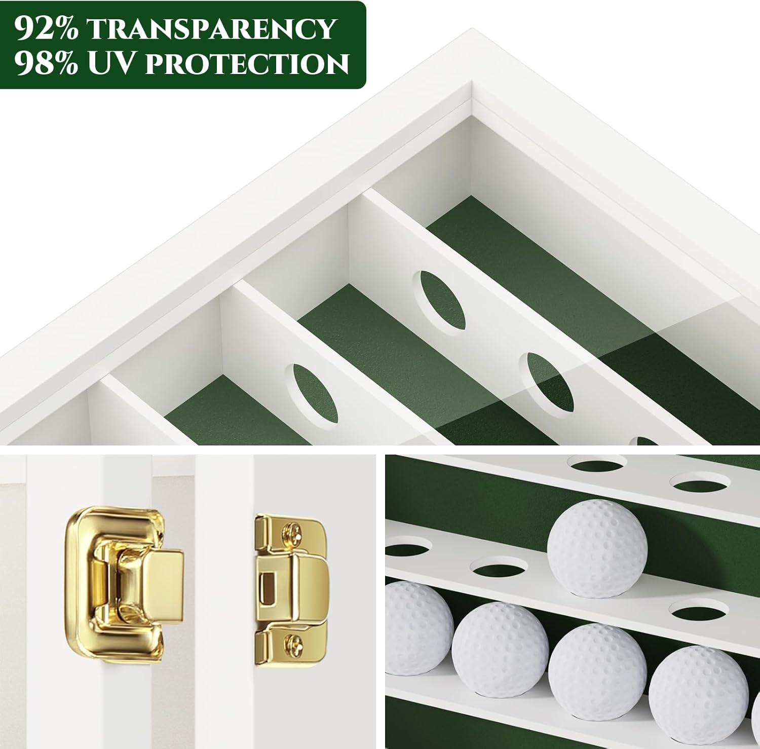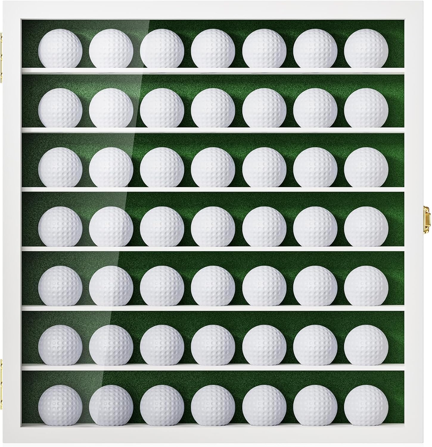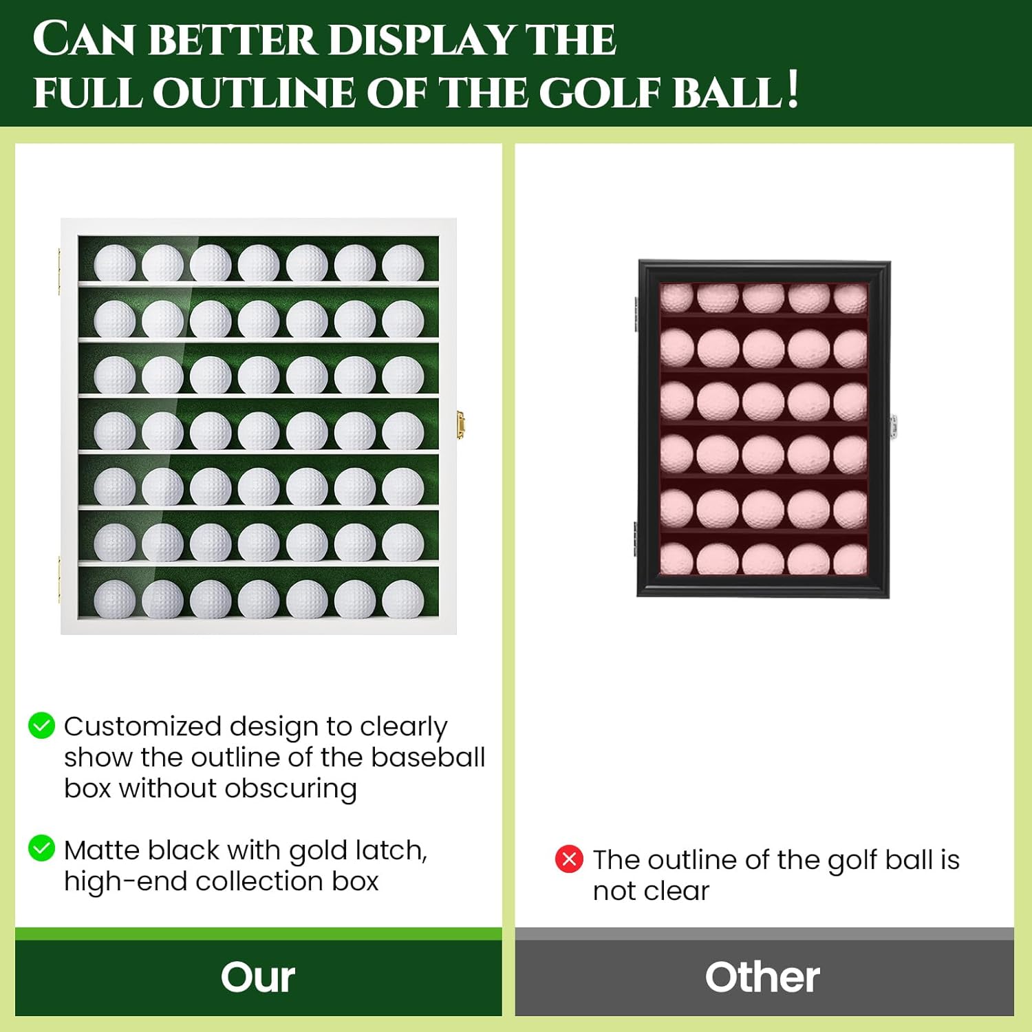 - Eye-Catching Golf Ball Display Case - Made by high quality wood panels, fitting for all golf ball fans. Green velvet-like fabric interior background, perfect contrast for showing off a collection of memorable golf balls.