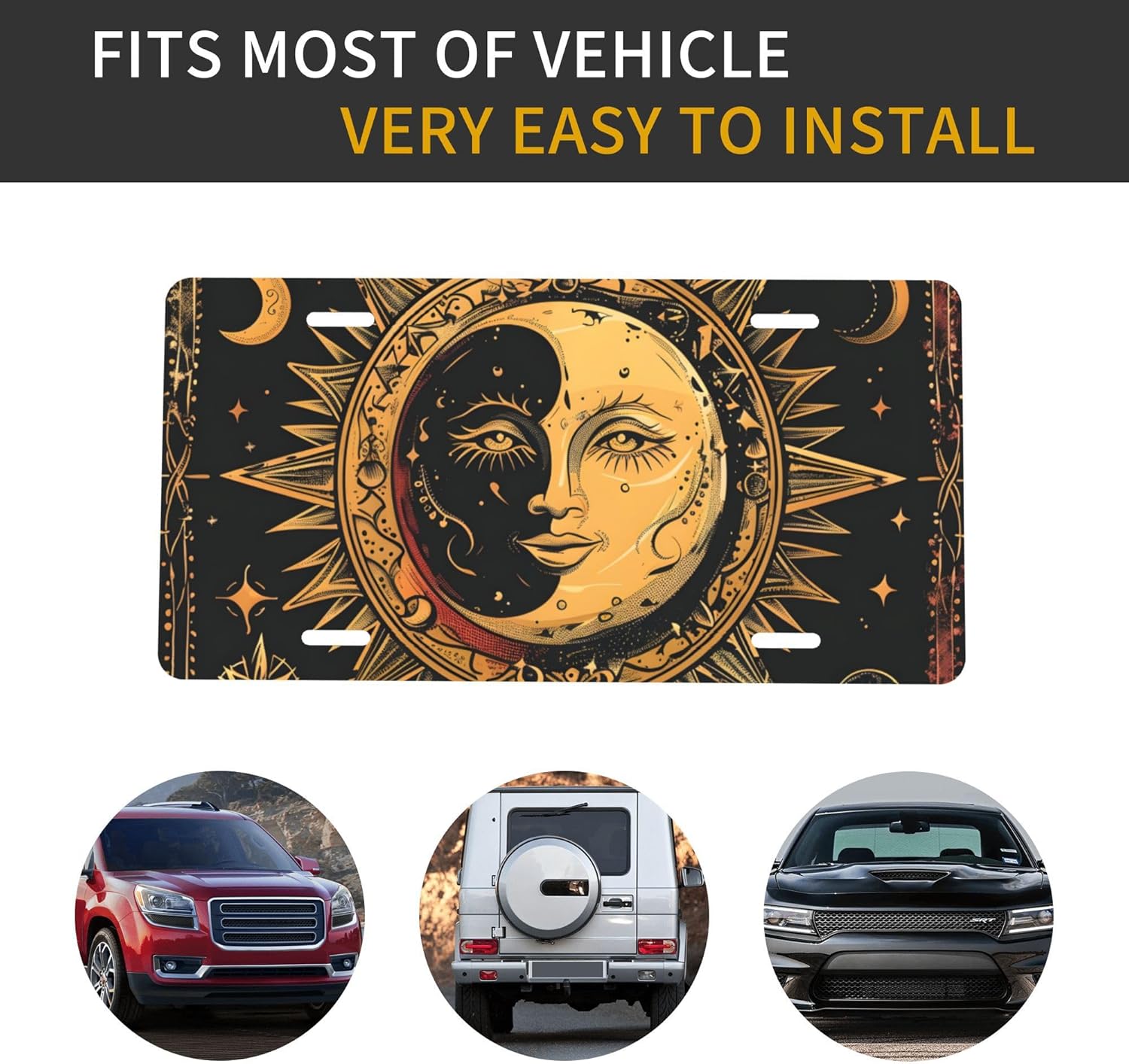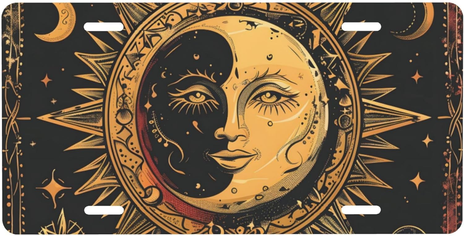 Front License Plate for Car Designs Ethnic Retro Sun Moon Stainless License Plate Cover Holder for Men Women Metal Aluminum Decorative Accessory Vanity Tag Standard 6 X 12 Inch (4 Holes)