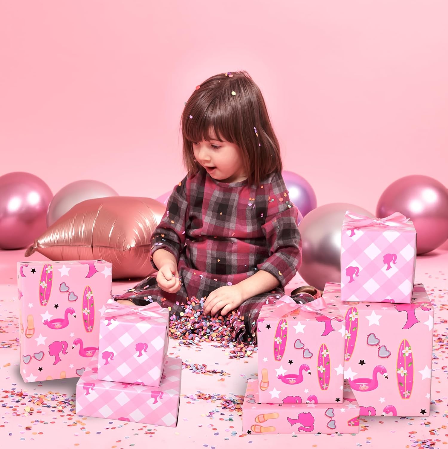 - Pink Design:This princess gift wrap features girl princess design,donut glass, on front side.The reversible side festures pink plaid pattern,which is unique to make it easy to add a personal touch to your present.