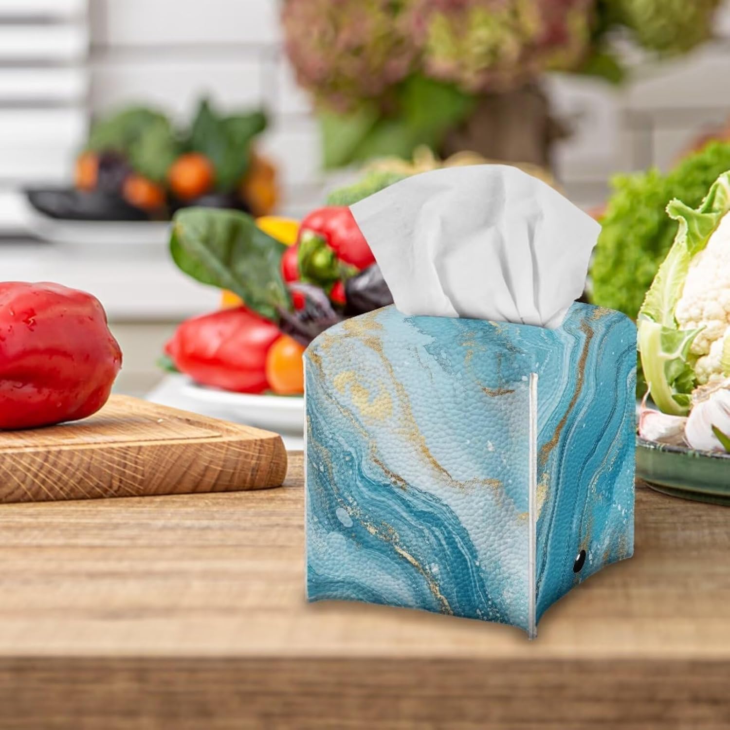 Marble Print Tissue Box Cover 5x5x5 inch Square PU Leather Facial Tissue Box Holder for Dresser Bathroom Decor Foldable Easy to Storage or Take